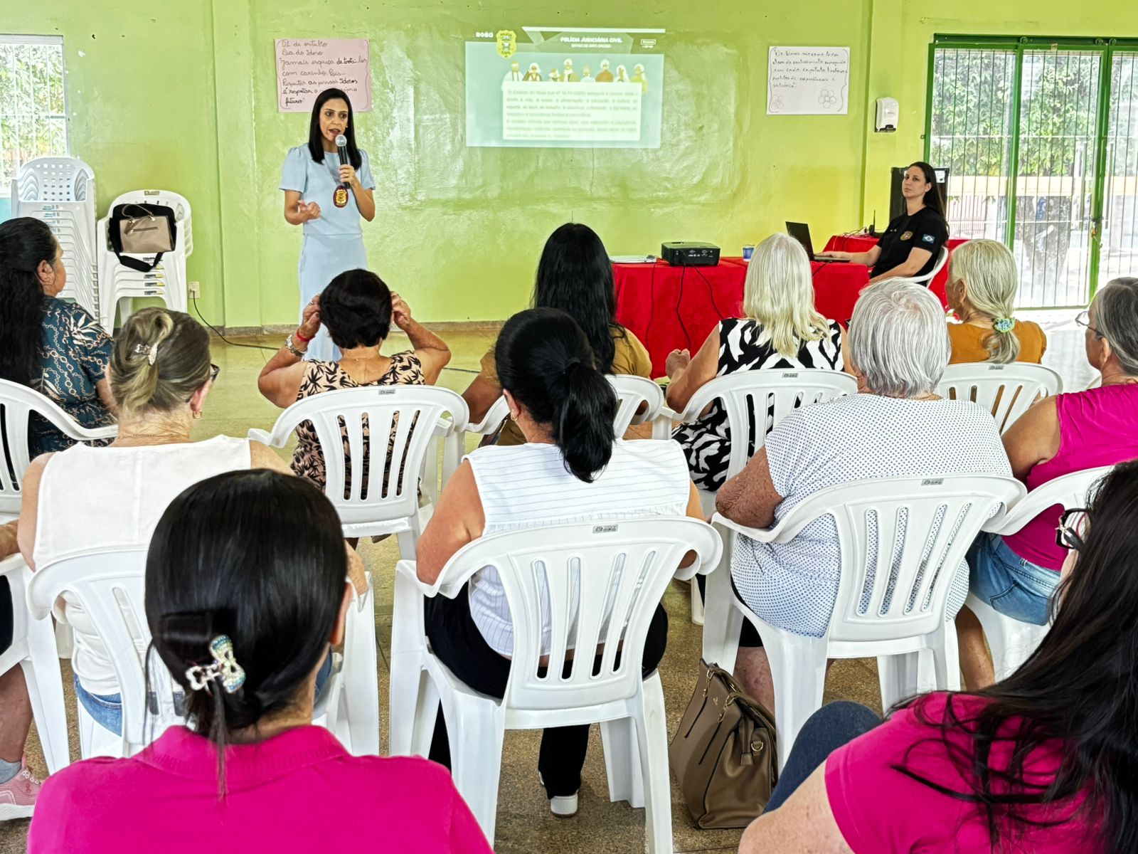A atividade foi conduzida pela delegada Dra. Layssa Crisóstomo de Paula Leal, que abordou diferentes formas de violência física, psicológica, financeira e negligência, além de destacar o papel fundamental da sociedade e dos órgãos públicos na proteção dos idosos. Durante a apresentação, a delegada também orientou o público sobre os canais de denúncia e os serviços de apoio disponíveis no município.