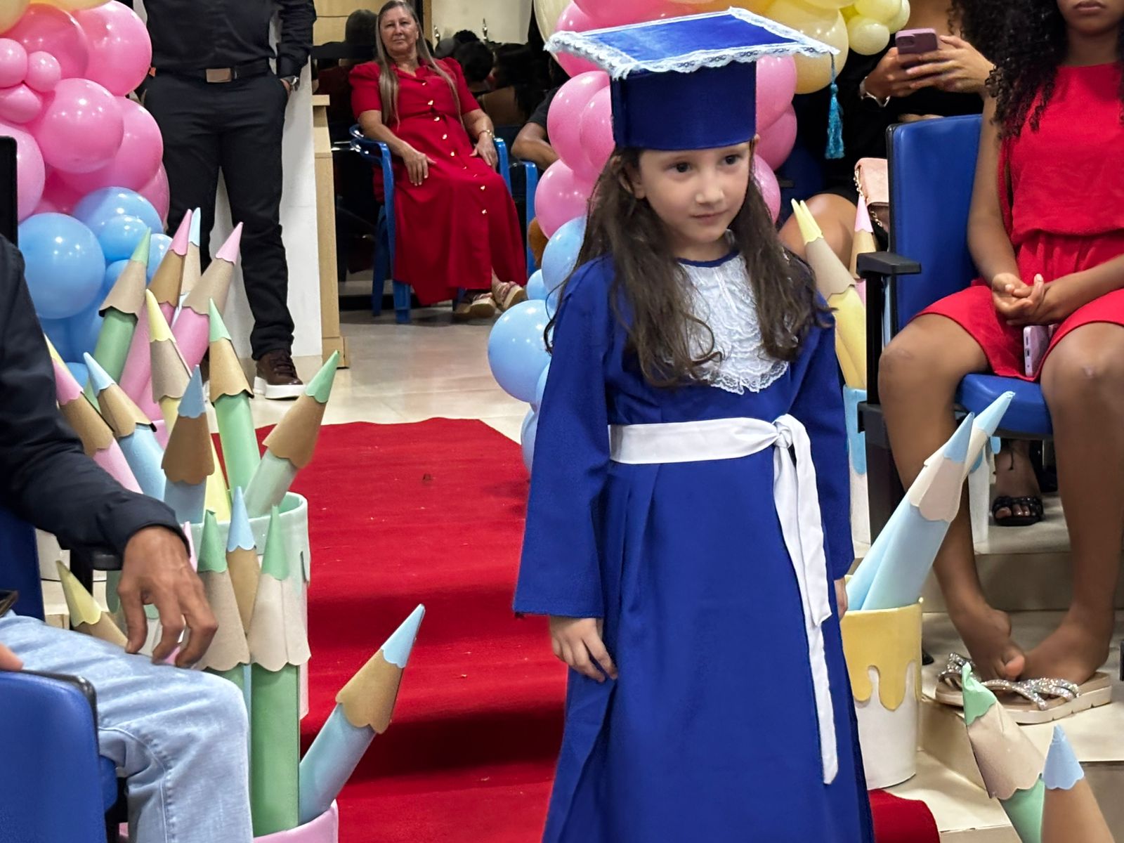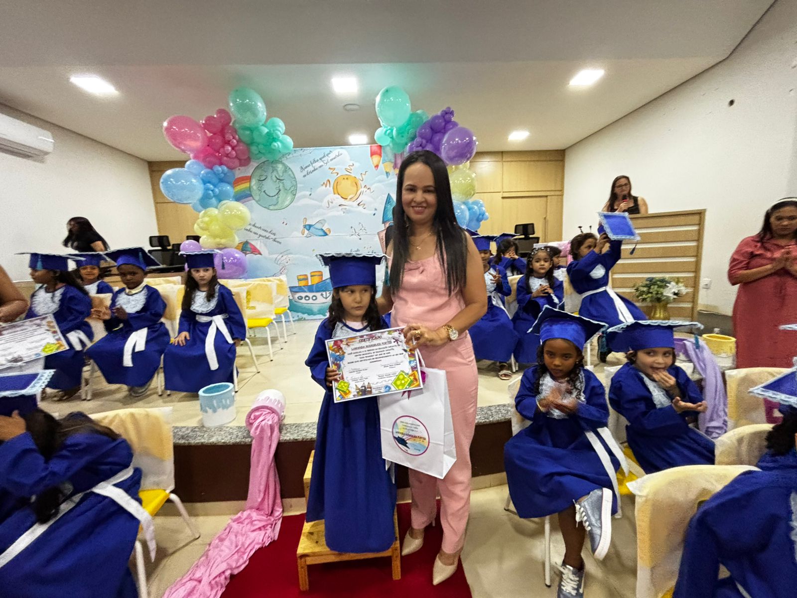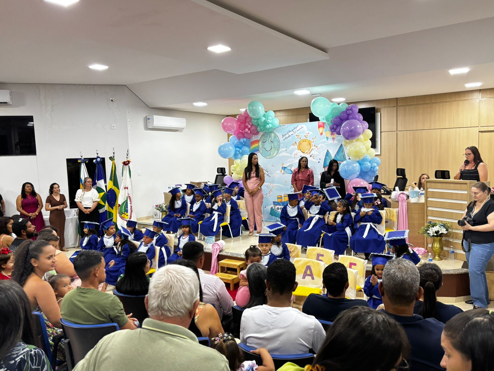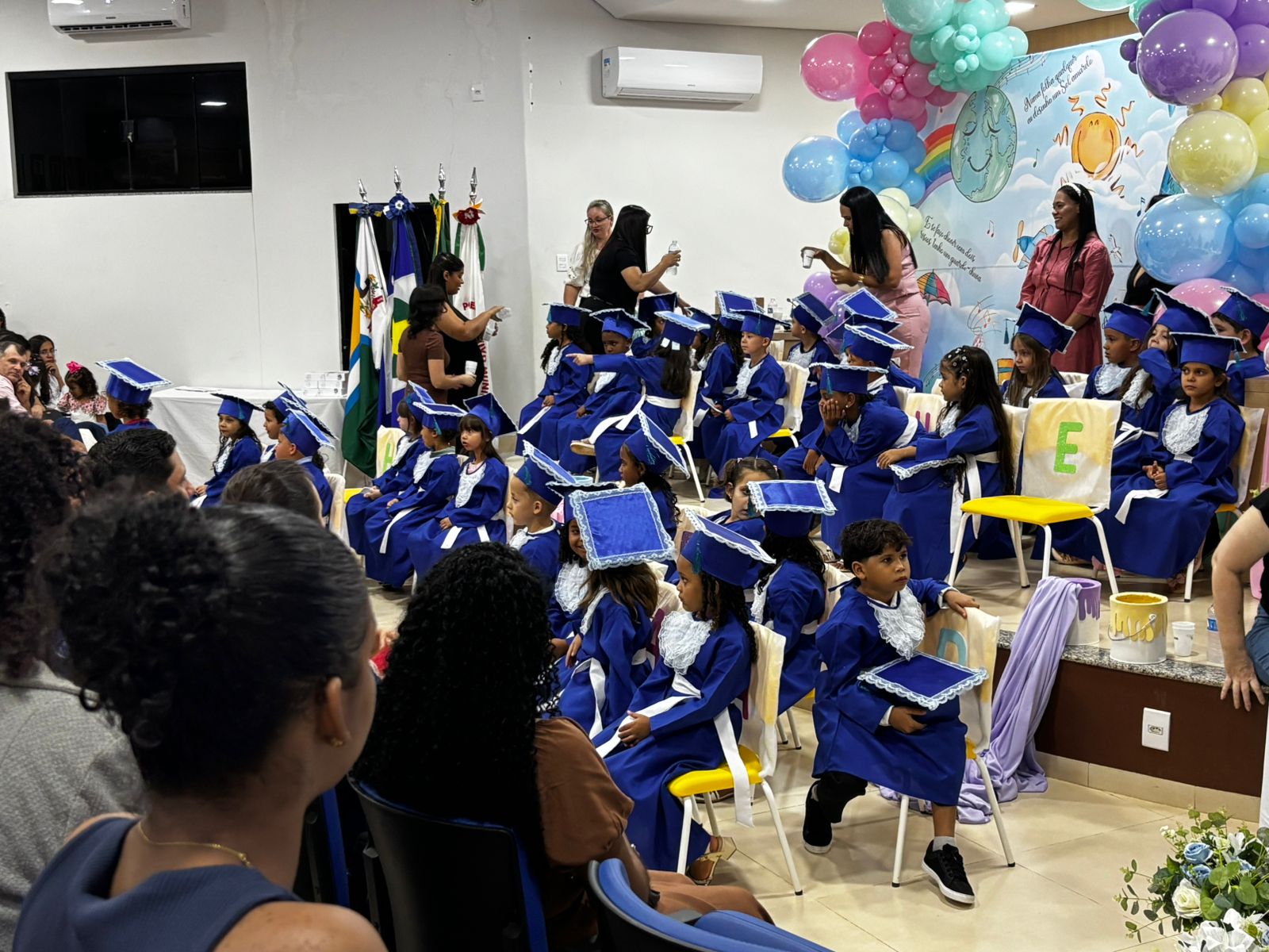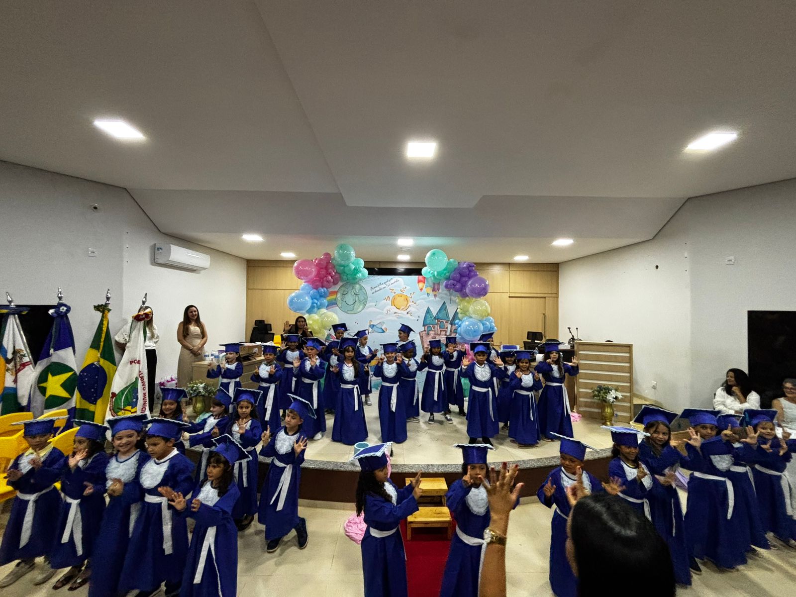 A primeira cerimônia aconteceu às 17h, e representaram a Secretaria de Educação a senhora Dilma Aparecida das Neves e a coordenadora de Educação Infantil, Brenda Fernandes. A solenidade contou com a dedicação das professoras responsáveis pelas turmas, que acompanharam o desenvolvimento dos alunos ao longo do ano letivo, além do apoio das auxiliares de sala, que contribuíram diretamente para o aprendizado e o cuidado diário das crianças. A formatura simbolizou o encerramento de um ciclo fundamental na vida escolar dos formandos.