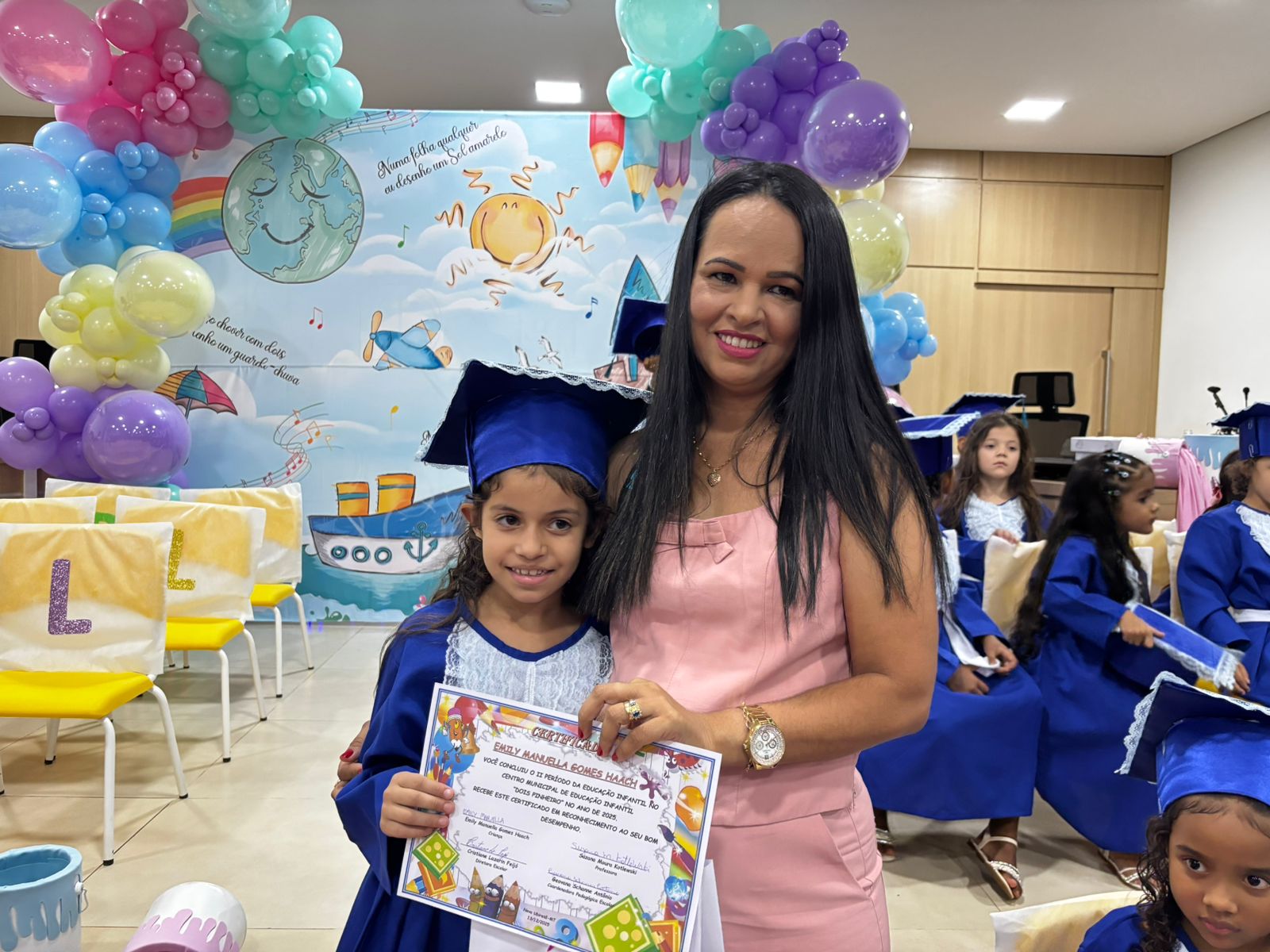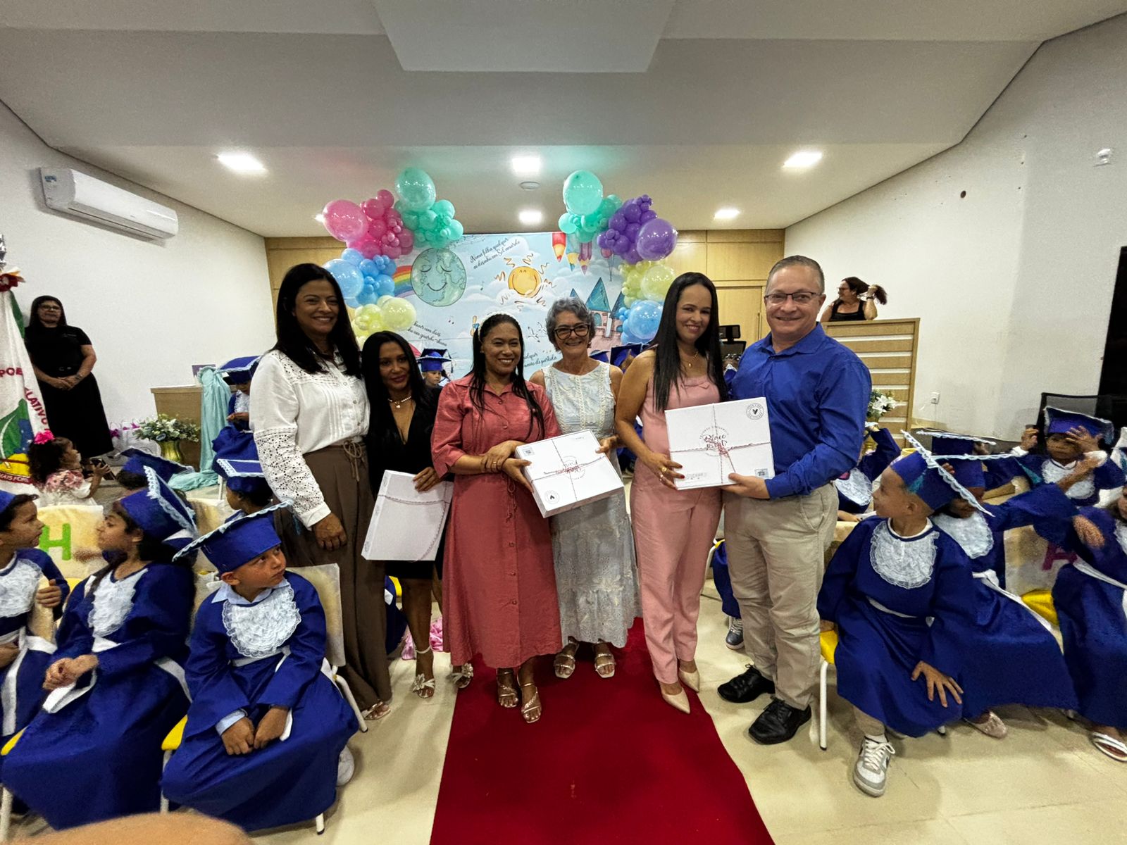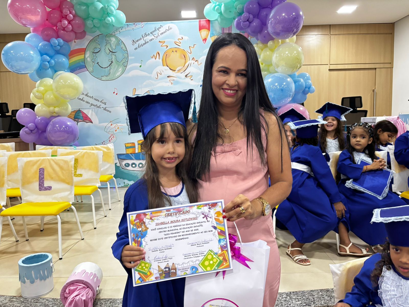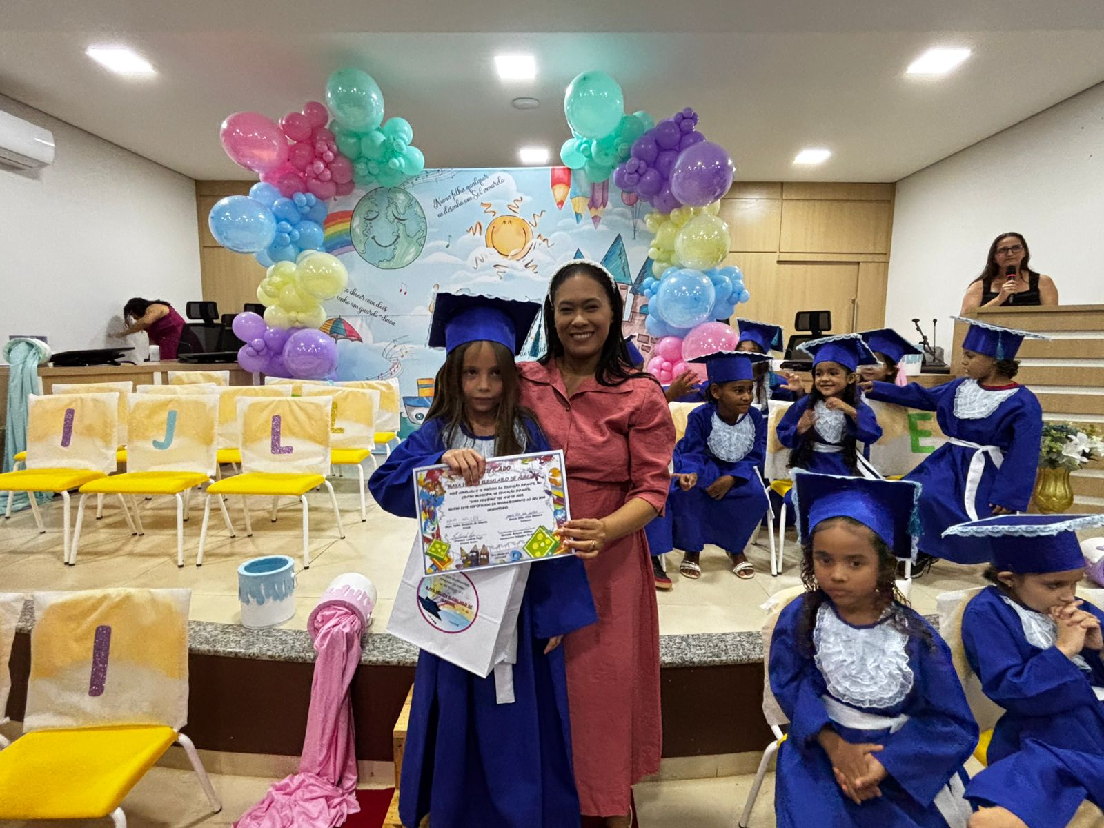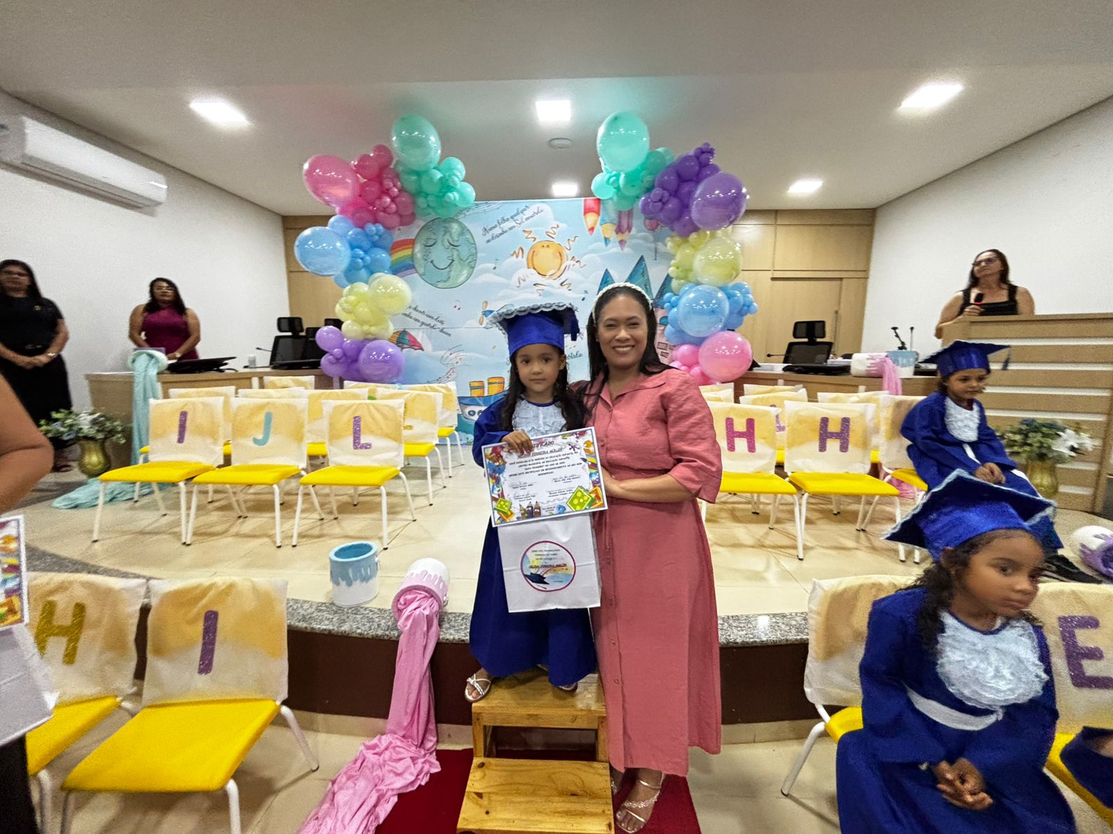 A primeira cerimônia aconteceu às 17h, e representaram a Secretaria de Educação a senhora Dilma Aparecida das Neves e a coordenadora de Educação Infantil, Brenda Fernandes. A solenidade contou com a dedicação das professoras responsáveis pelas turmas, que acompanharam o desenvolvimento dos alunos ao longo do ano letivo, além do apoio das auxiliares de sala, que contribuíram diretamente para o aprendizado e o cuidado diário das crianças. A formatura simbolizou o encerramento de um ciclo fundamental na vida escolar dos formandos.