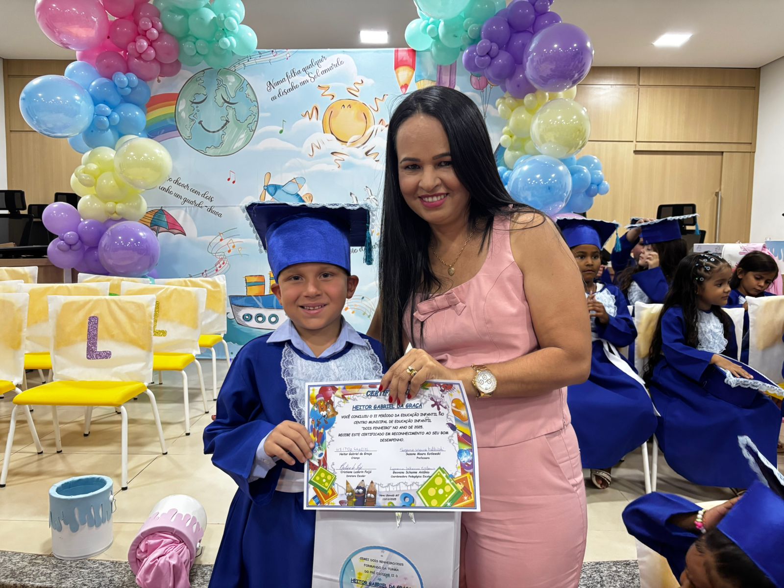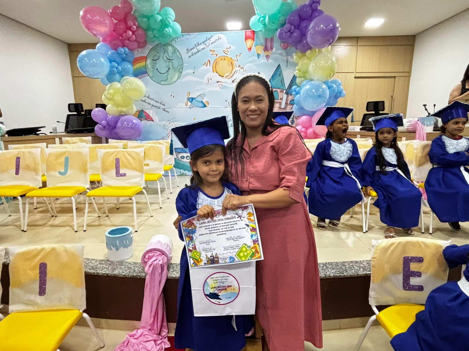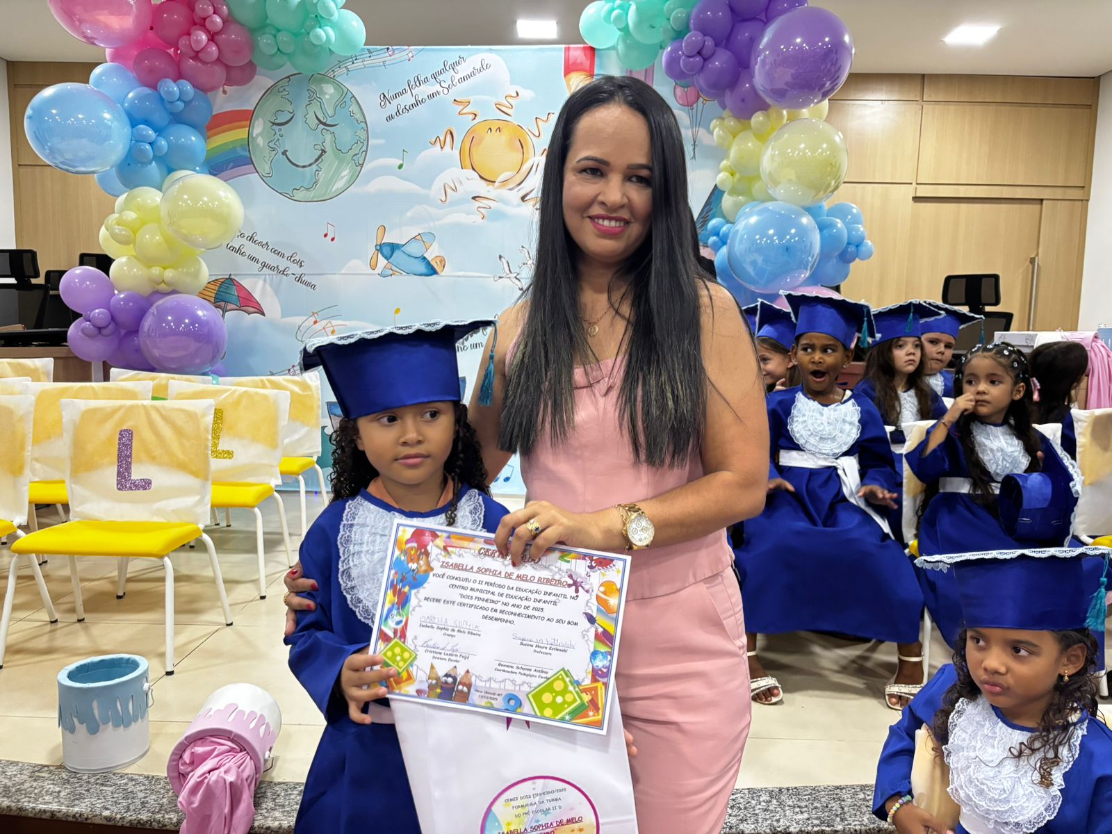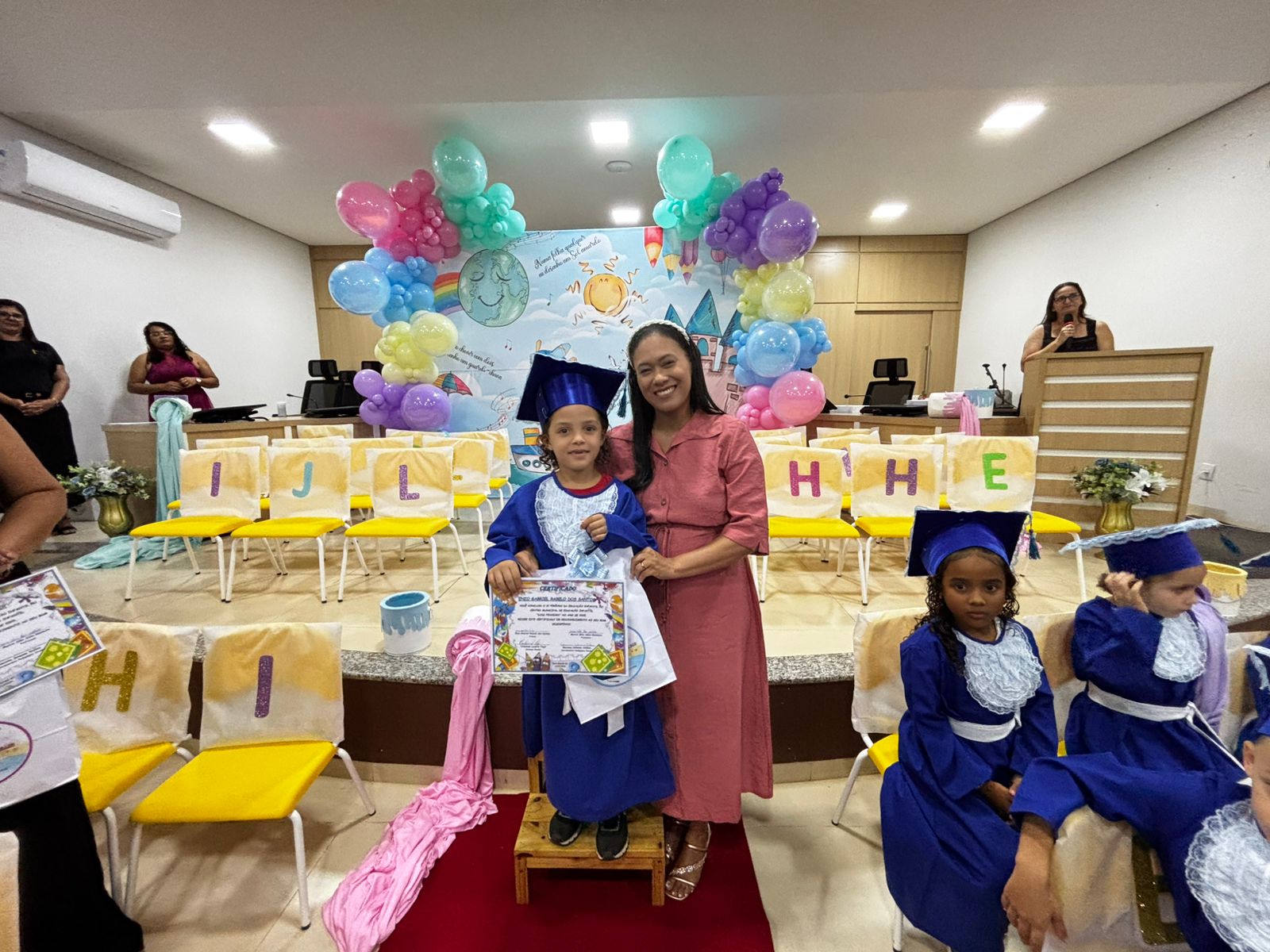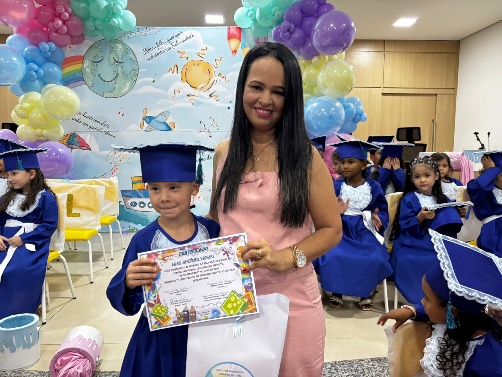 A primeira cerimônia aconteceu às 17h, e representaram a Secretaria de Educação a senhora Dilma Aparecida das Neves e a coordenadora de Educação Infantil, Brenda Fernandes. A solenidade contou com a dedicação das professoras responsáveis pelas turmas, que acompanharam o desenvolvimento dos alunos ao longo do ano letivo, além do apoio das auxiliares de sala, que contribuíram diretamente para o aprendizado e o cuidado diário das crianças. A formatura simbolizou o encerramento de um ciclo fundamental na vida escolar dos formandos.