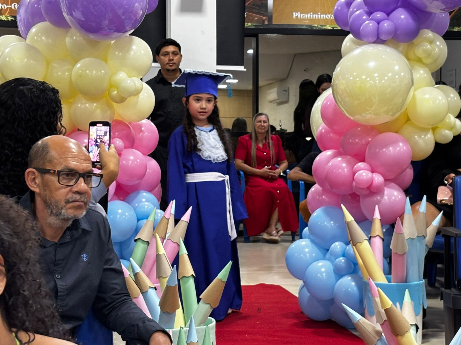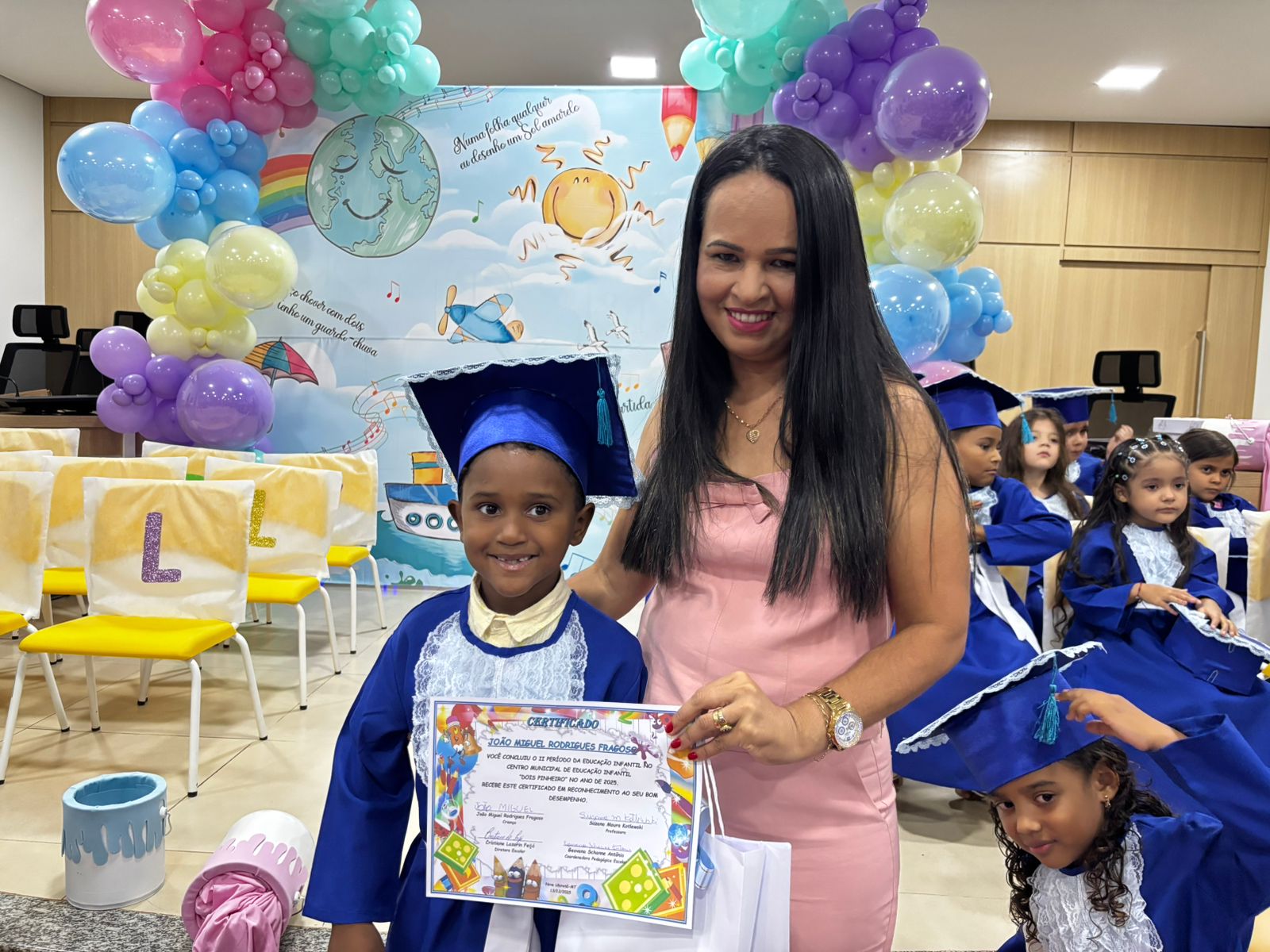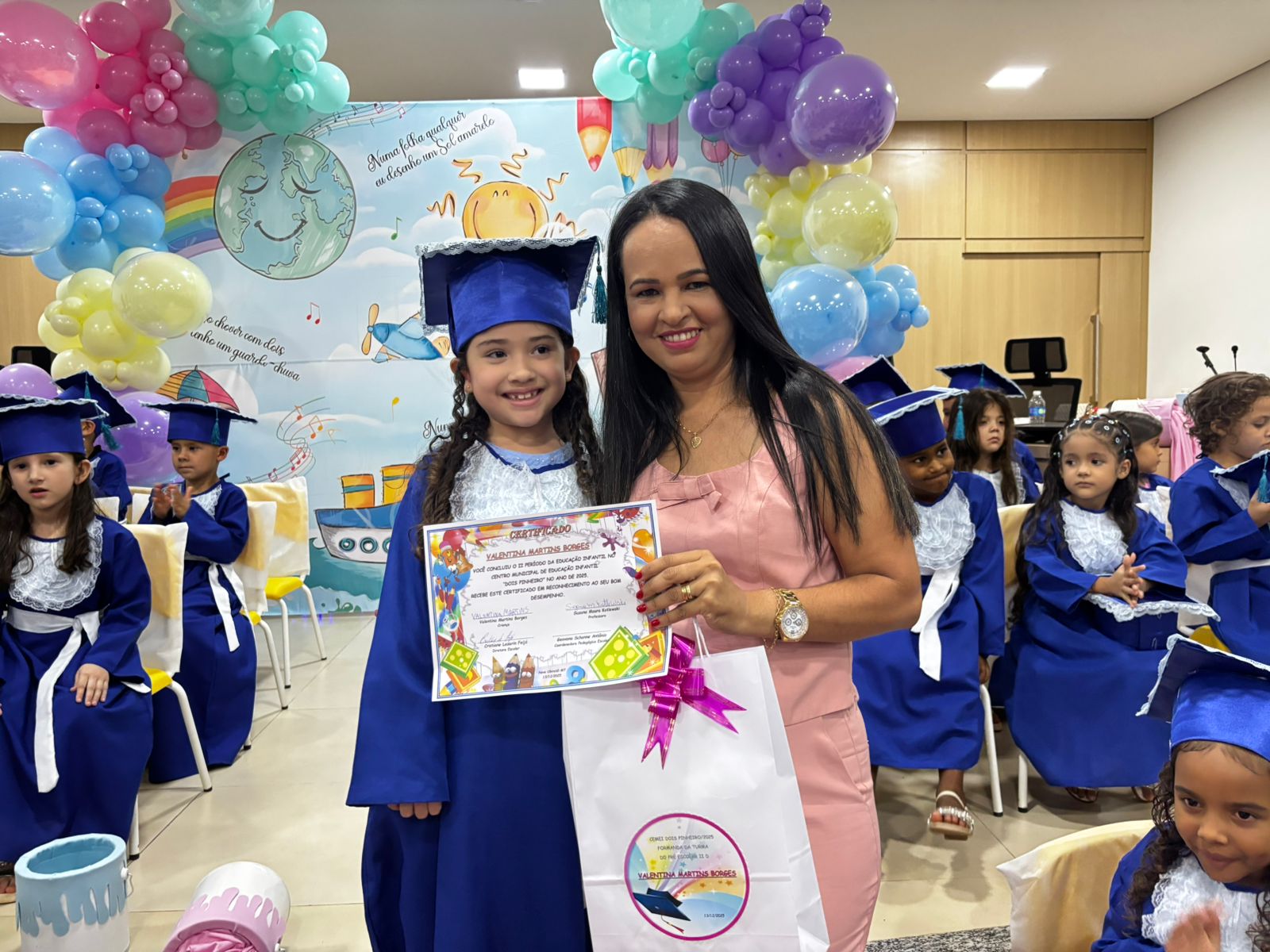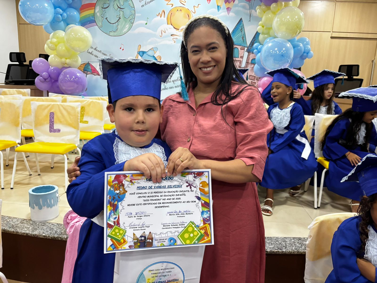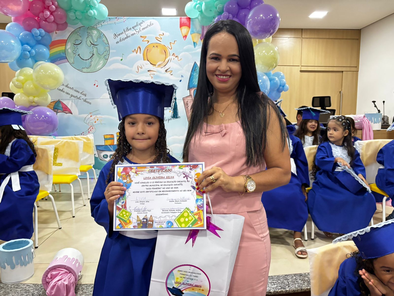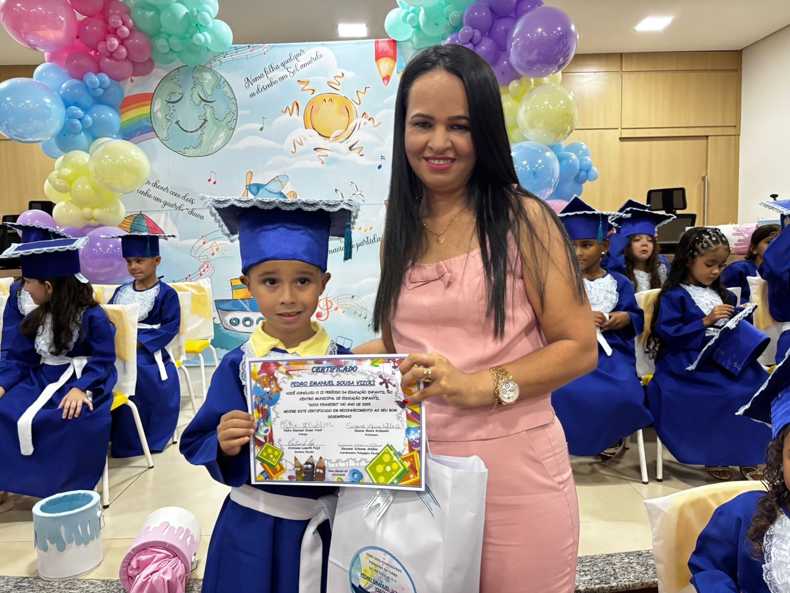 A primeira cerimônia aconteceu às 17h, e representaram a Secretaria de Educação a senhora Dilma Aparecida das Neves e a coordenadora de Educação Infantil, Brenda Fernandes. A solenidade contou com a dedicação das professoras responsáveis pelas turmas, que acompanharam o desenvolvimento dos alunos ao longo do ano letivo, além do apoio das auxiliares de sala, que contribuíram diretamente para o aprendizado e o cuidado diário das crianças. A formatura simbolizou o encerramento de um ciclo fundamental na vida escolar dos formandos.