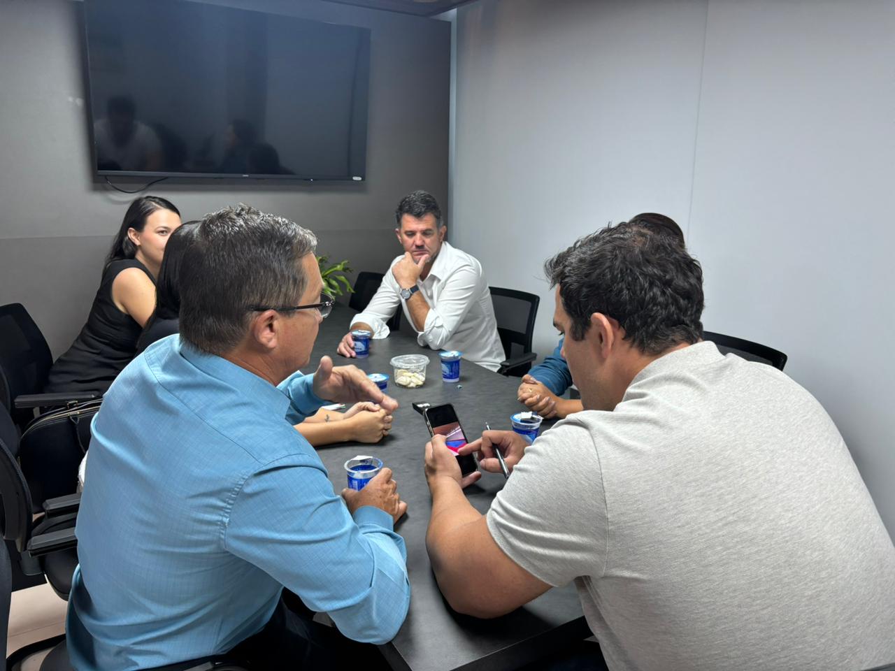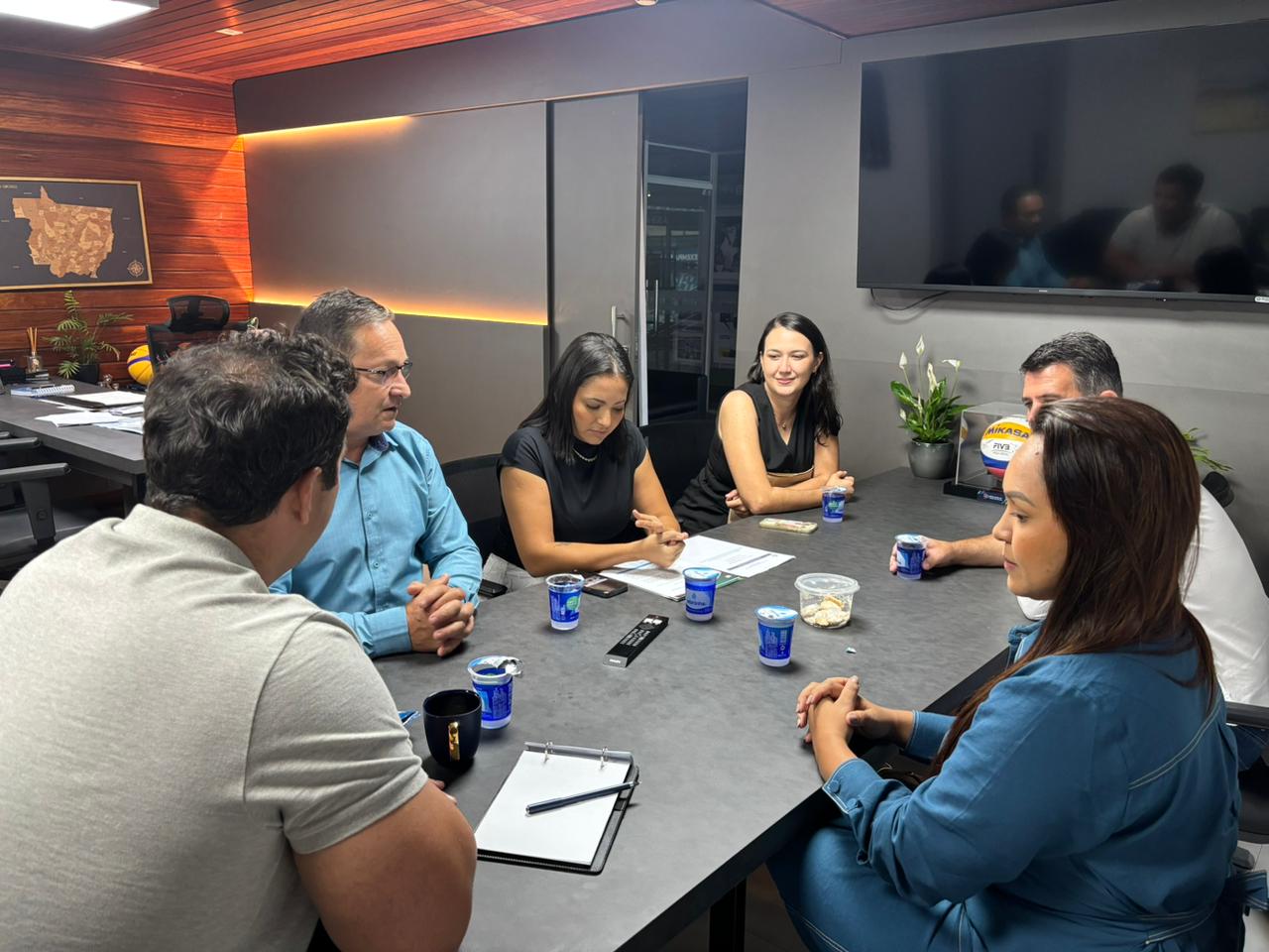 Encerrando os compromissos do dia, as autoridades municipais estiveram reunidas com o Secretário de Estado de Cultura, Esporte e Lazer (SECEL), David Moura, em busca de recursos e parcerias para fomentar e fortalecer os projetos desenvolvidos pela Secretaria Municipal de Esporte e Lazer e pelo Departamento de Cultura.