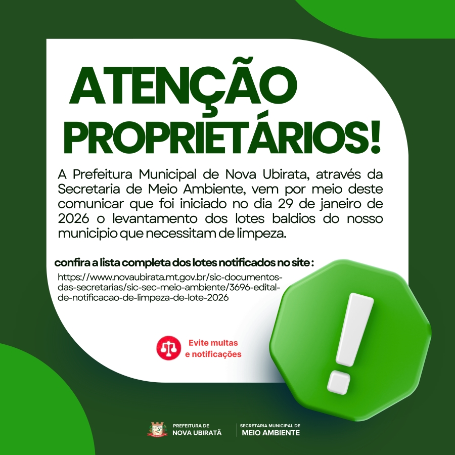 A Prefeitura Municipal de Nova Ubiratã, por meio da Secretaria Municipal de Meio Ambiente, publicou o Edital de Notificação nº 03/2026 informando o início do levantamento de lotes baldios que necessitam de limpeza no município. A ação teve início no dia 29 de janeiro de 2026 e tem como objetivo promover a organização urbana e prevenir problemas de saúde pública.
