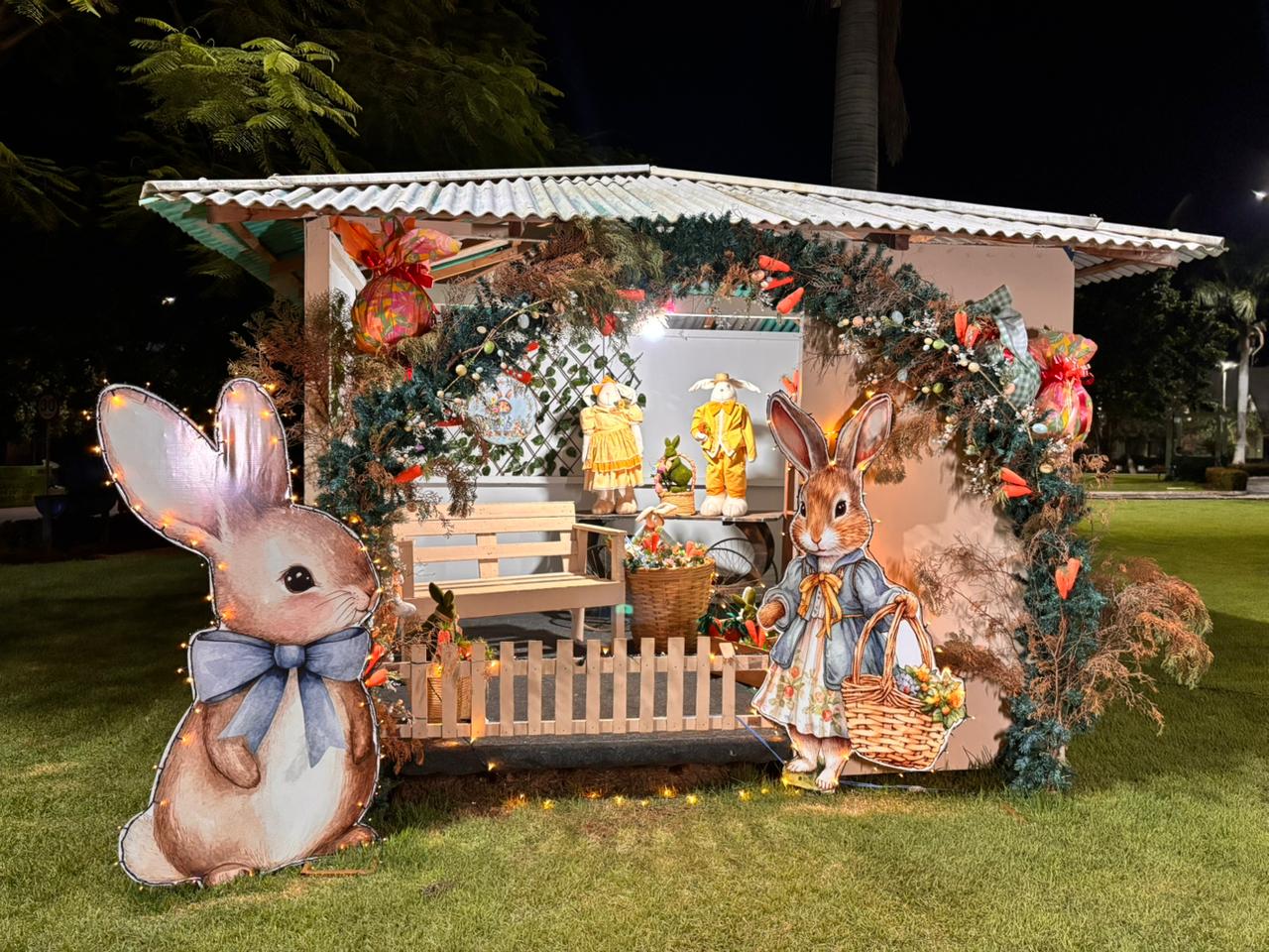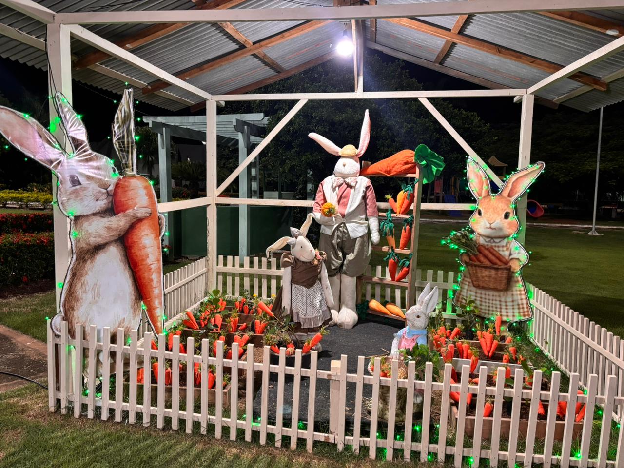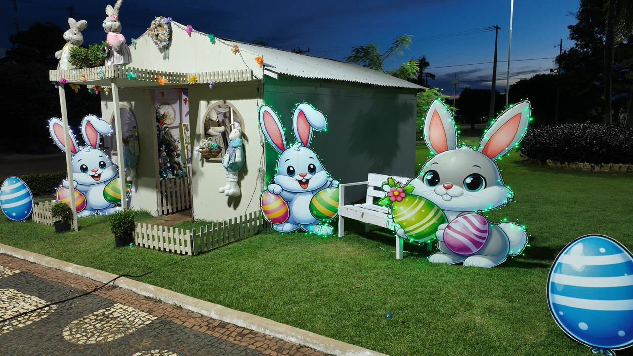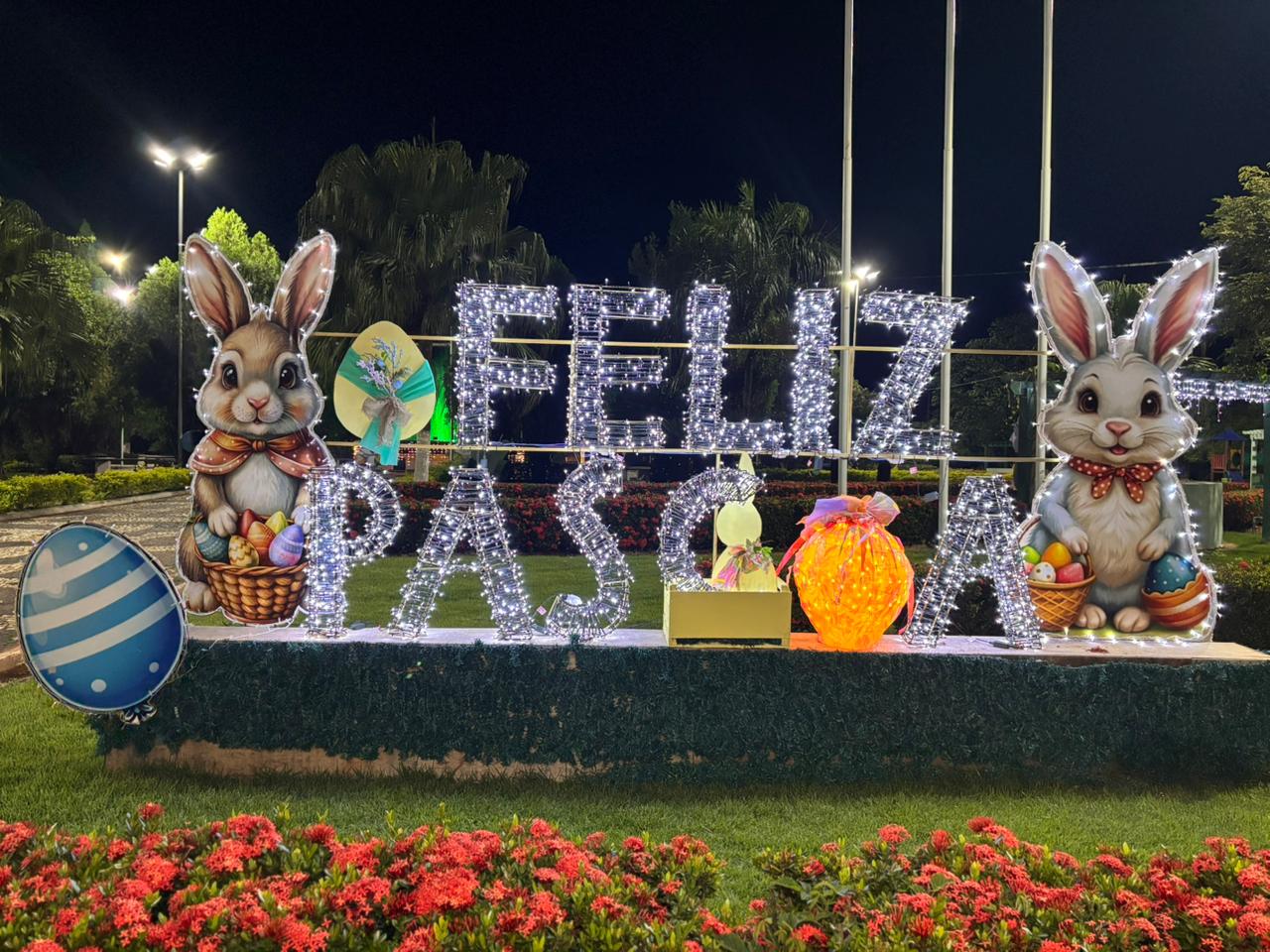 O espaço foi preparado com elementos temáticos e iluminação especial, criando um ambiente acolhedor e festivo para que a população possa visitar, registrar momentos em família e celebrar o espírito da Páscoa.