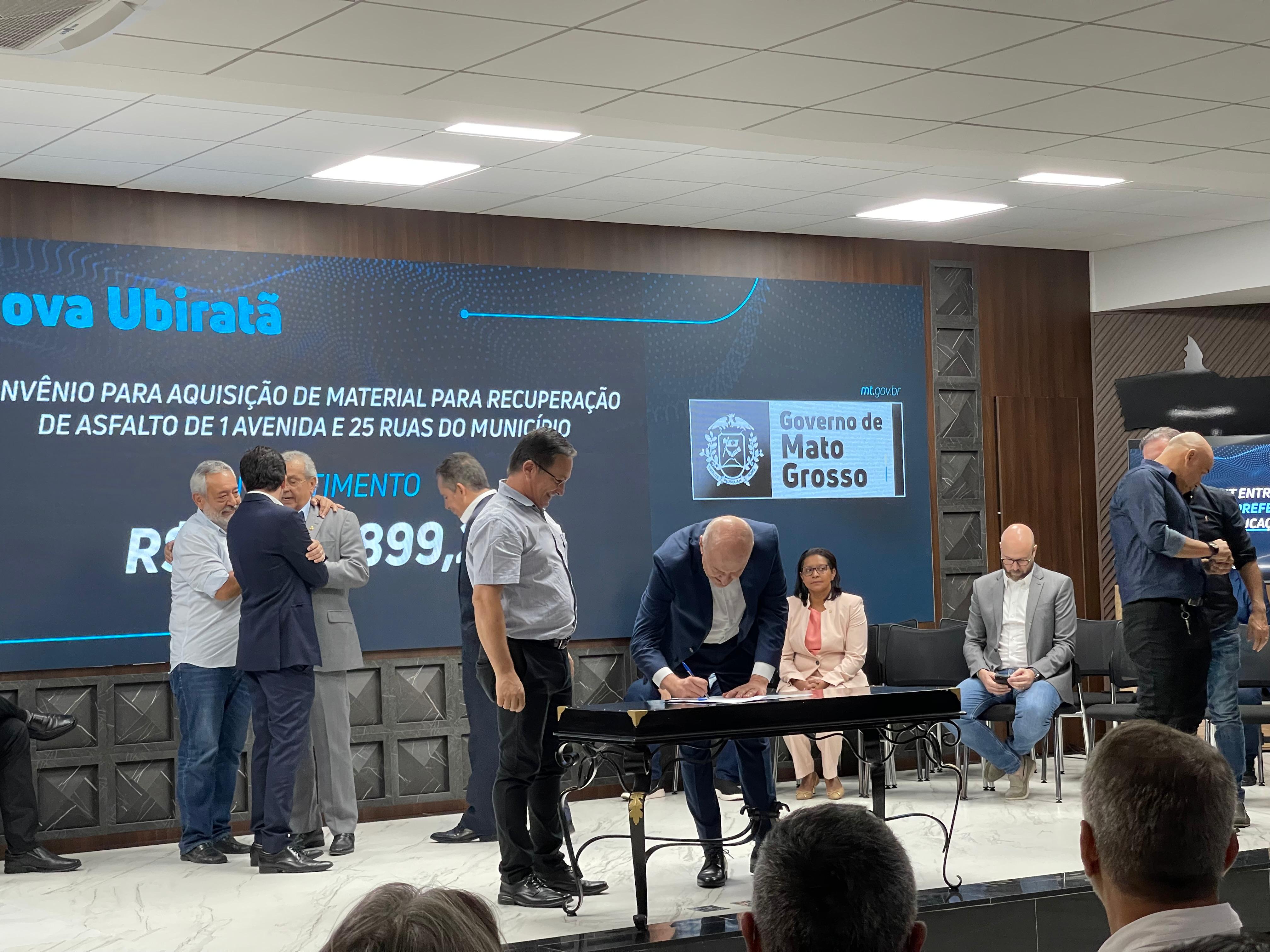 Na tarde desta quinta-feira (25), o Governo do Estado de Mato Grosso, através da Secretaria de Estado de Infraestrutura e Logística (SINFRA), realizou a solenidade de assinatura de convênios com 27 Prefeituras, para obras de infraestrutura nos municípios. No qual, Nova Ubiratã assinou um convênio no valor de R$4.612.899,25, que será utilizado para aquisição de materiais para recuperação de asfalto de 1 avenida e 25 ruas do município.