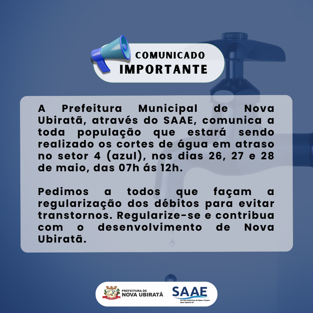 A Prefeitura Municipal de Nova Ubiratã, através do Serviço Autônomo de Água e Esgoto (SAAE), divulga para toda população o novo cronograma de corte de água em atraso para o mês de maio.