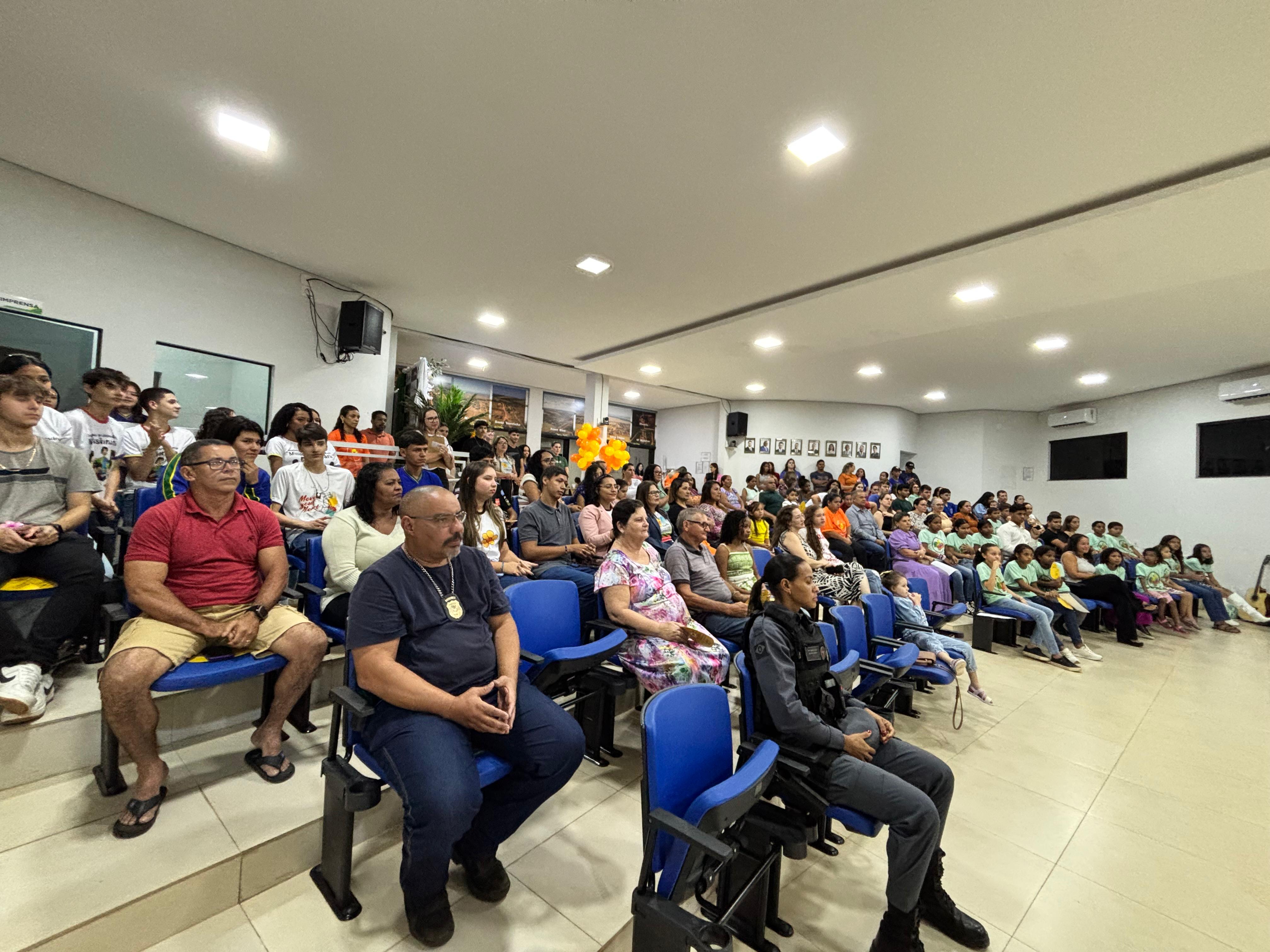 A noite foi marcada com três apresentações, a 1º pelas crianças do Serviço de Convivência e Fortalecimento de Vínculos (SCFV), a 2ª pelo professor de música, Ézus e a 3ª pelo Grupo da Adolescência Missionária.