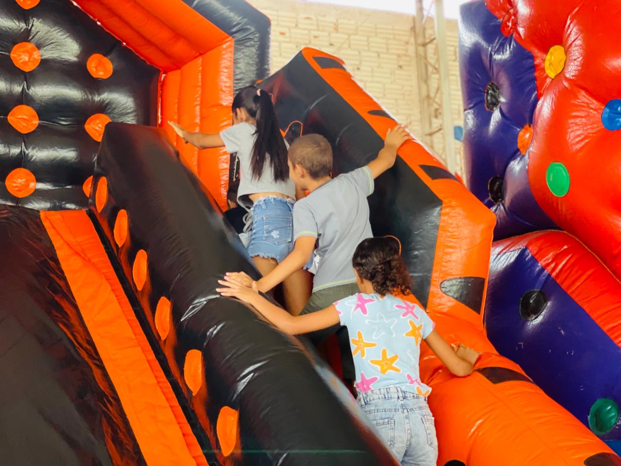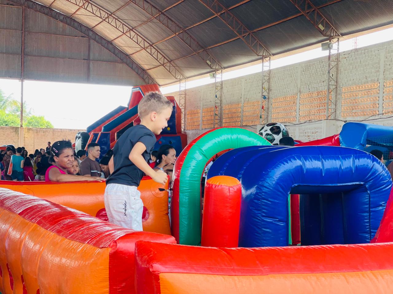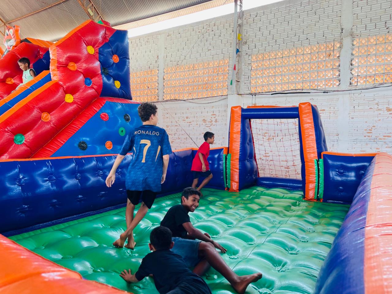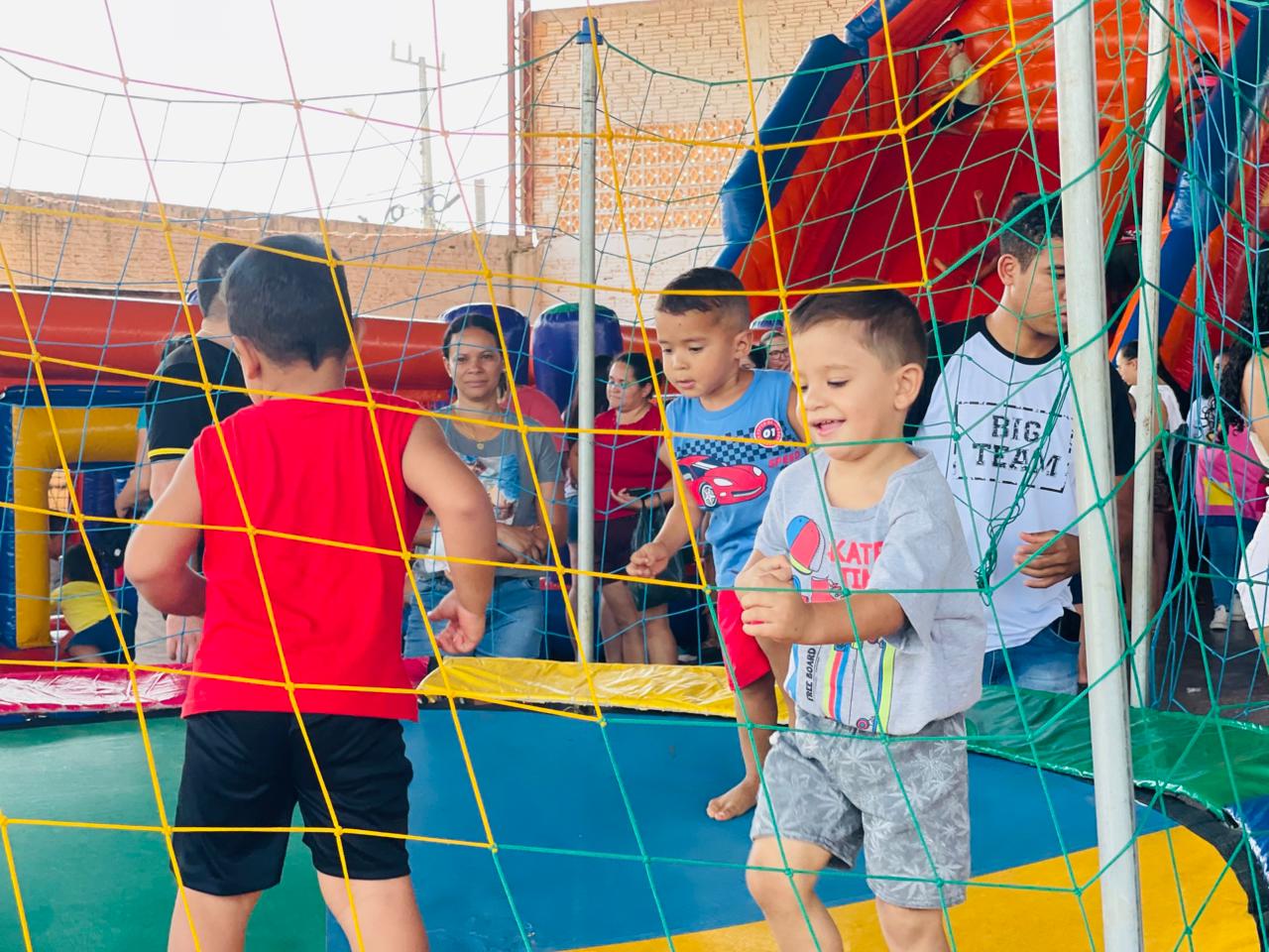 A festividade contou com vários brinquedos infláveis, algodão-doce, pipoca, cachorro-quente, refrigerante e distribuição de doces, garantindo momentos de alegria e confraternização entre as crianças presentes. O evento foi um verdadeiro sucesso, proporcionando uma tarde de muita animação e sorrisos.