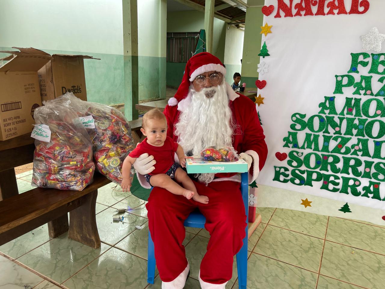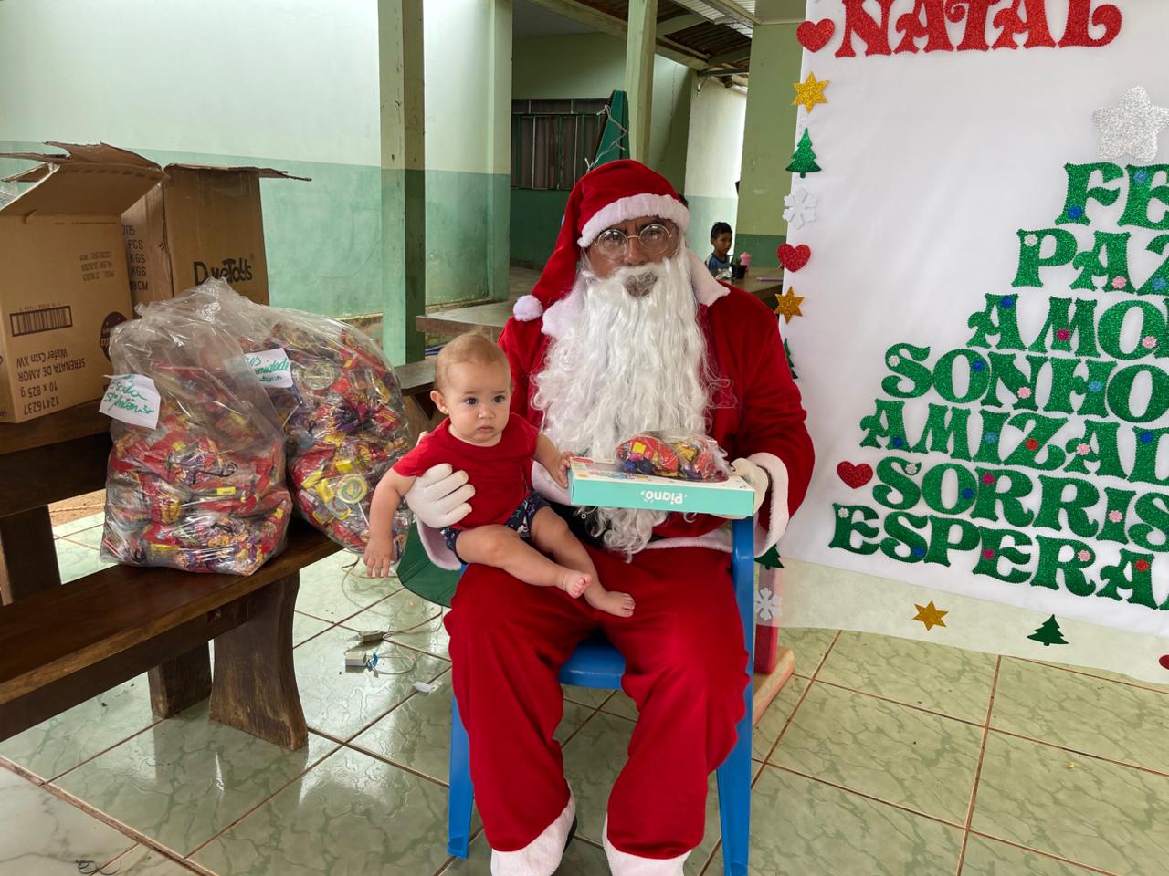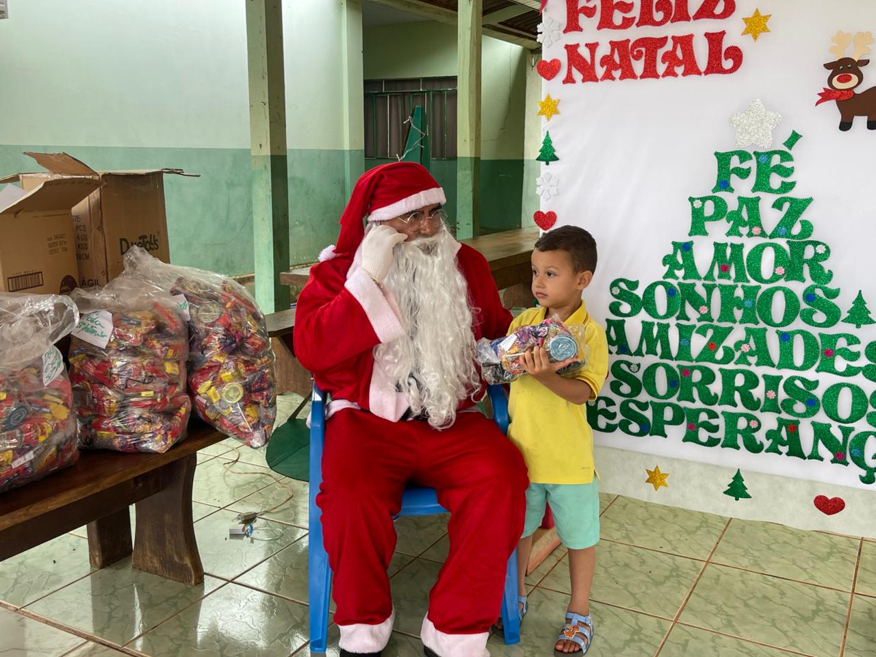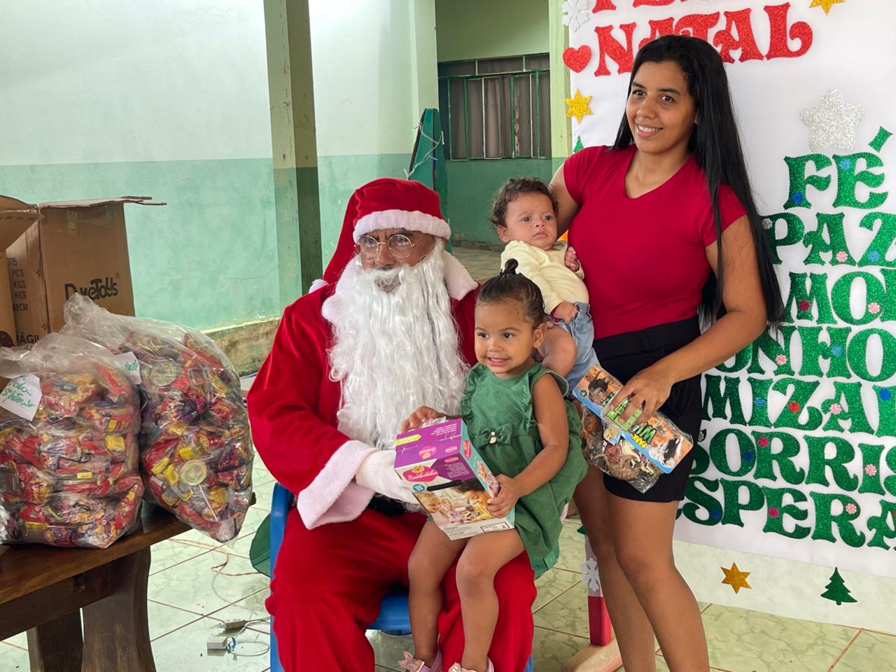 A entrega dos doces e brinquedos foi conduzida pela Secretária Municipal de Assistência Social, Marqueli Carvalho, que esteve acompanhada do Papai Noel, proporcionando às crianças um momento especial de confraternização e celebração do espírito natalino. A presença simbólica do Papai Noel contribuiu para tornar o encontro ainda mais marcante para as famílias.