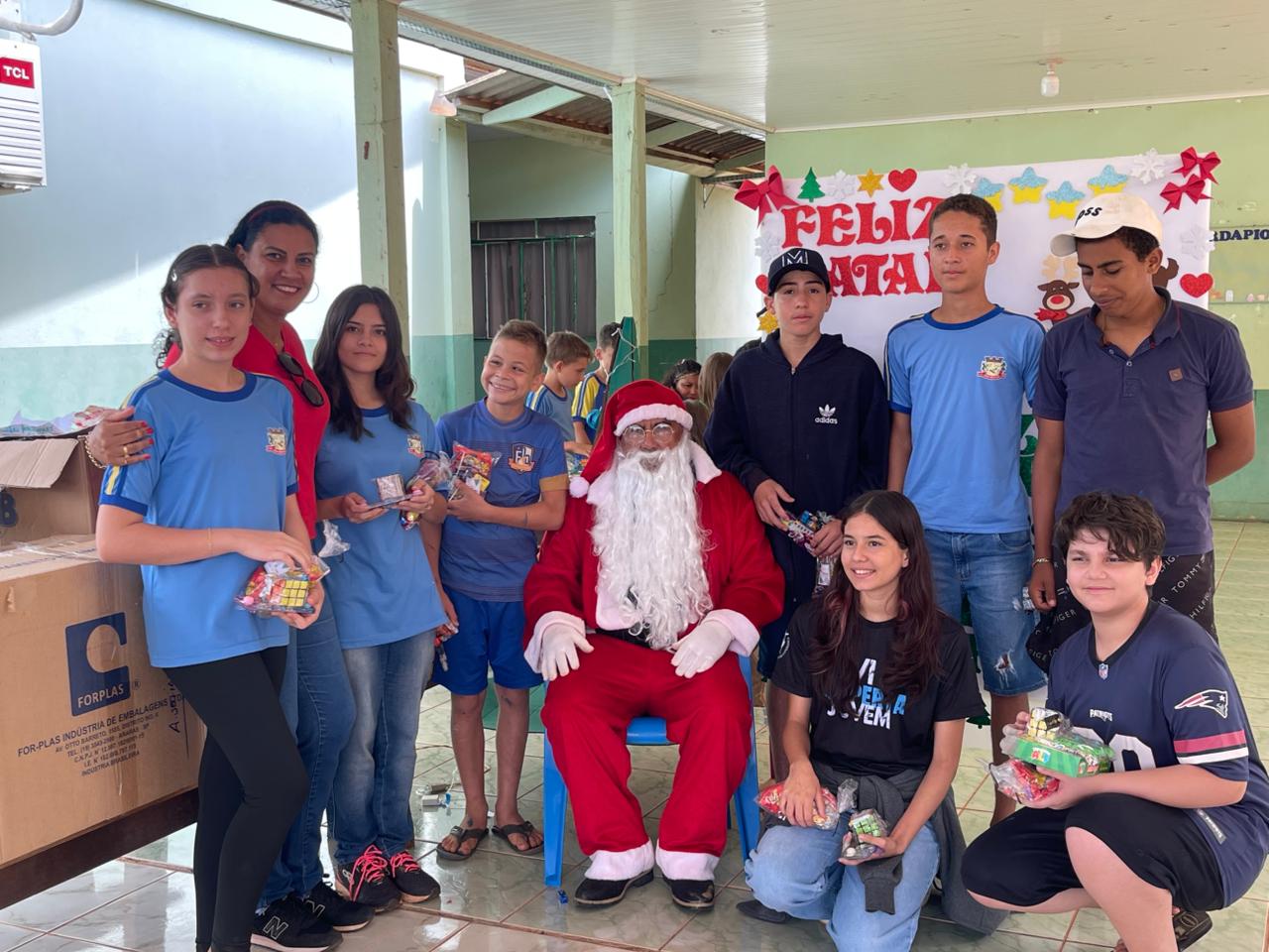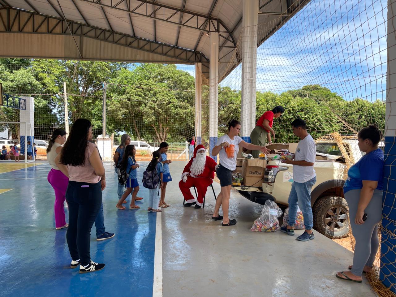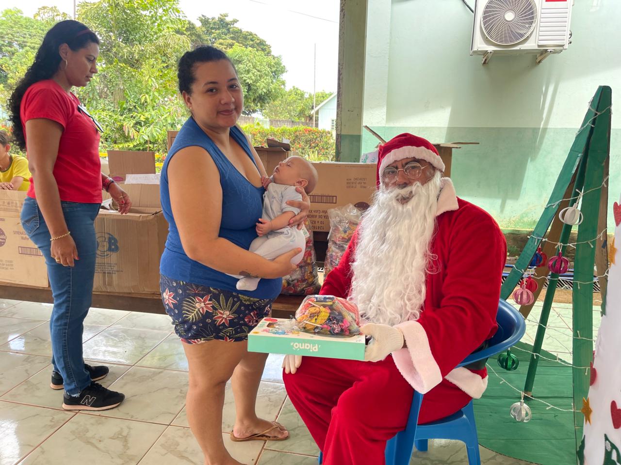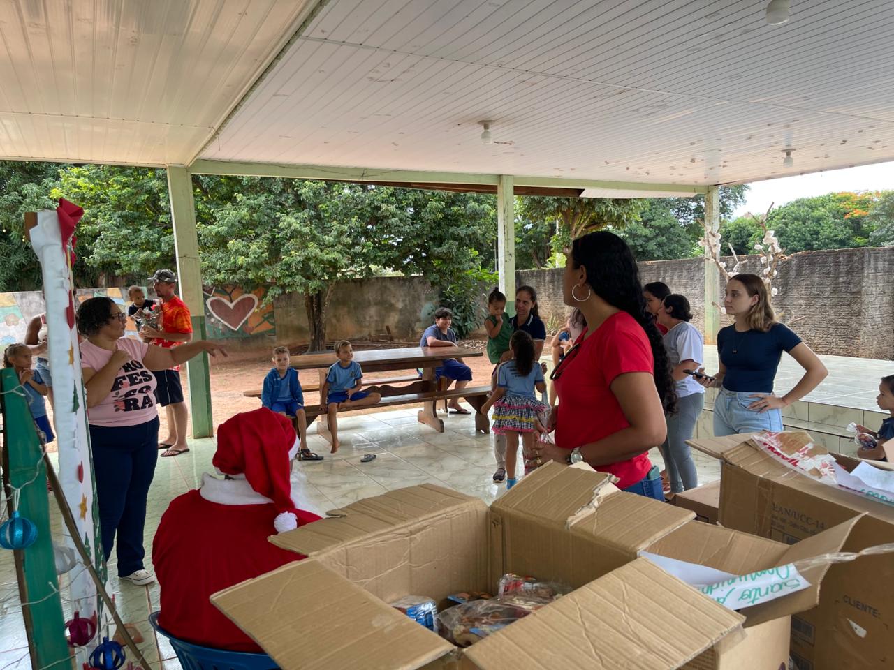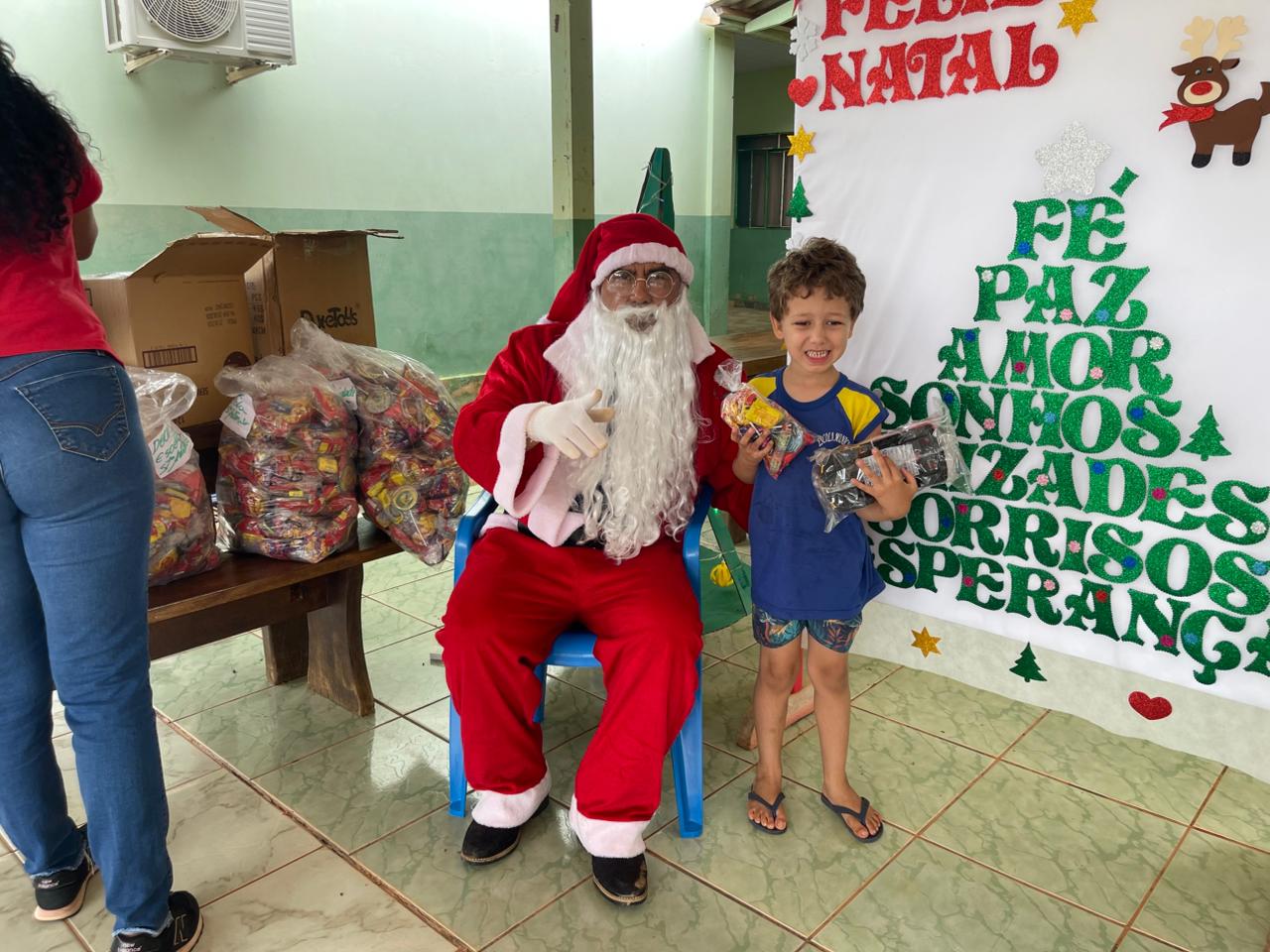 A entrega dos doces e brinquedos foi conduzida pela Secretária Municipal de Assistência Social, Marqueli Carvalho, que esteve acompanhada do Papai Noel, proporcionando às crianças um momento especial de confraternização e celebração do espírito natalino. A presença simbólica do Papai Noel contribuiu para tornar o encontro ainda mais marcante para as famílias.