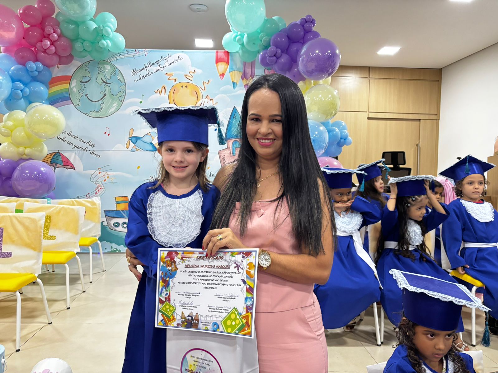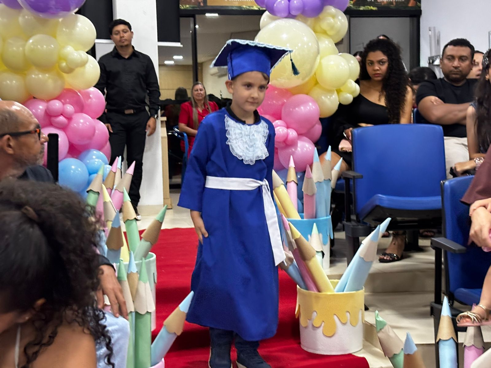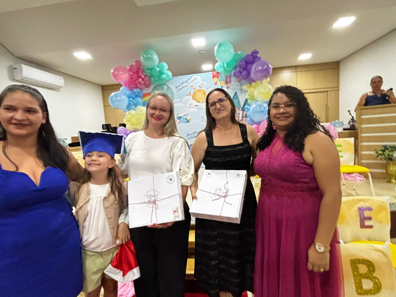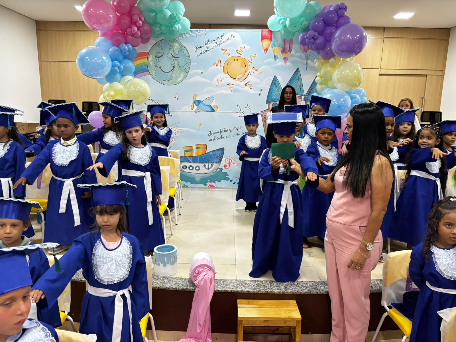 A primeira cerimônia aconteceu às 17h, e representaram a Secretaria de Educação a senhora Dilma Aparecida das Neves e a coordenadora de Educação Infantil, Brenda Fernandes. A solenidade contou com a dedicação das professoras responsáveis pelas turmas, que acompanharam o desenvolvimento dos alunos ao longo do ano letivo, além do apoio das auxiliares de sala, que contribuíram diretamente para o aprendizado e o cuidado diário das crianças. A formatura simbolizou o encerramento de um ciclo fundamental na vida escolar dos formandos.