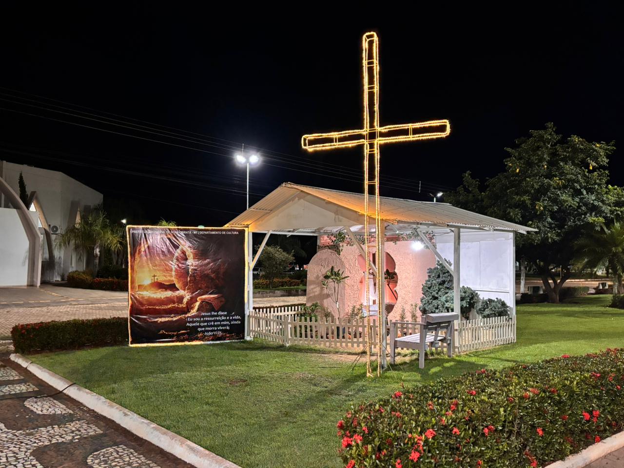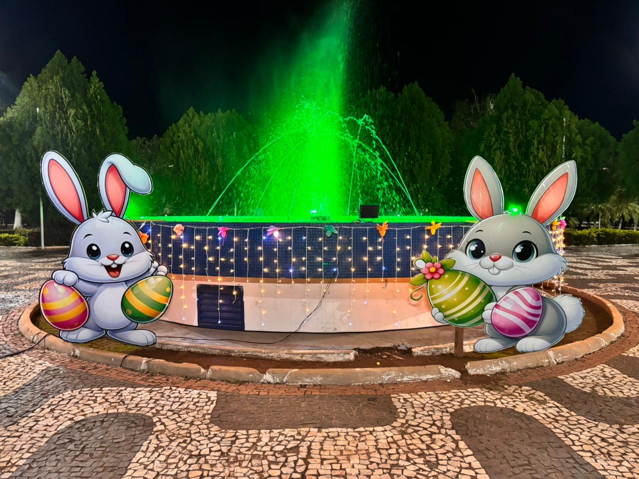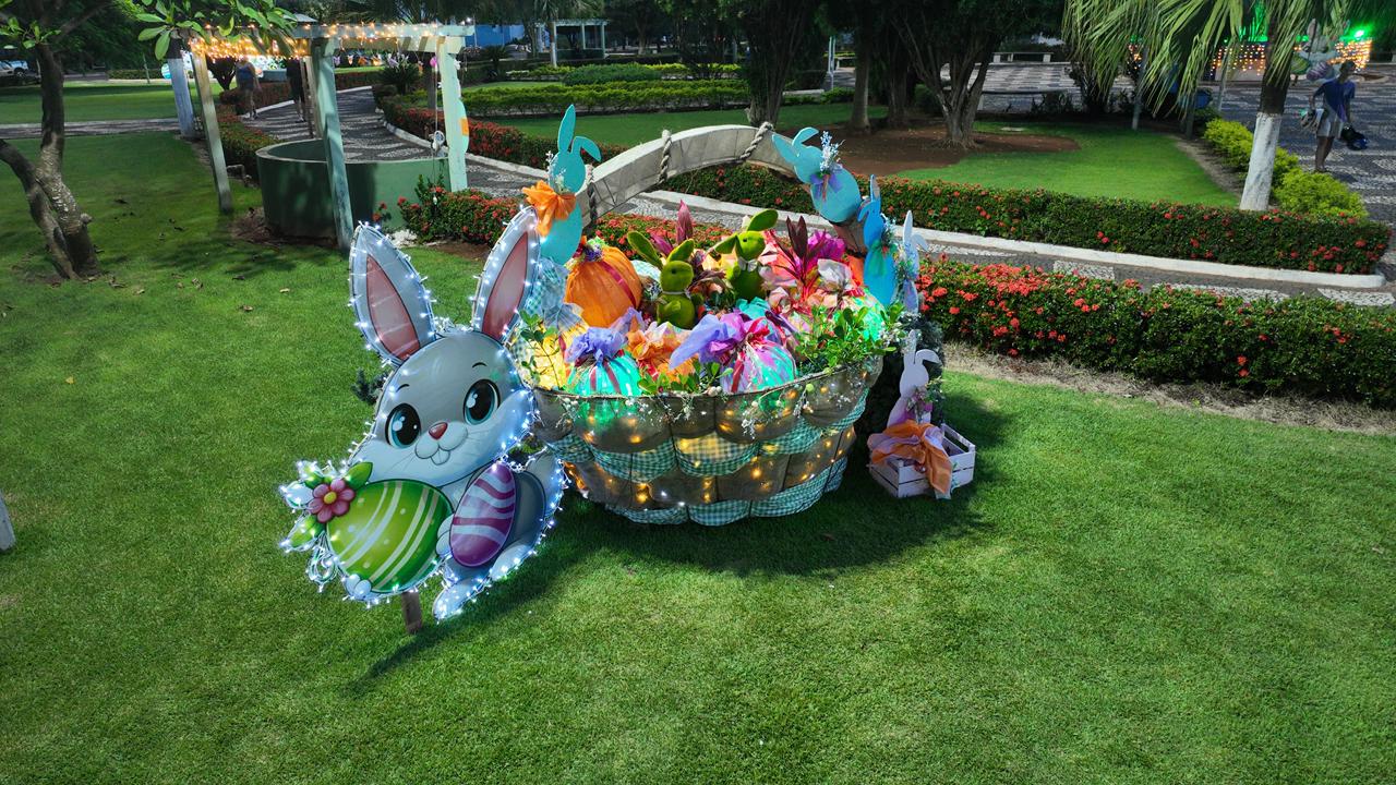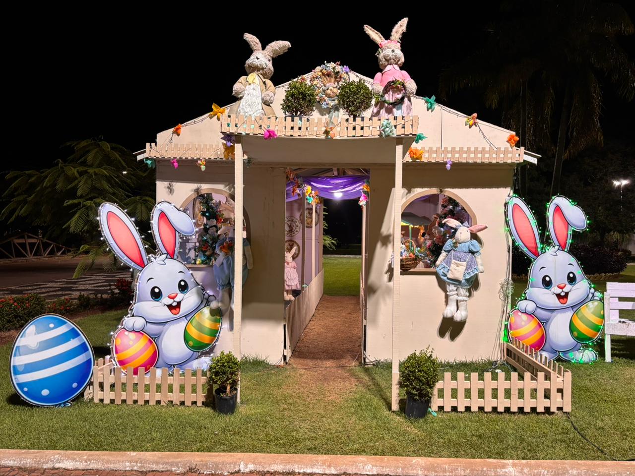 O espaço foi preparado com elementos temáticos e iluminação especial, criando um ambiente acolhedor e festivo para que a população possa visitar, registrar momentos em família e celebrar o espírito da Páscoa.