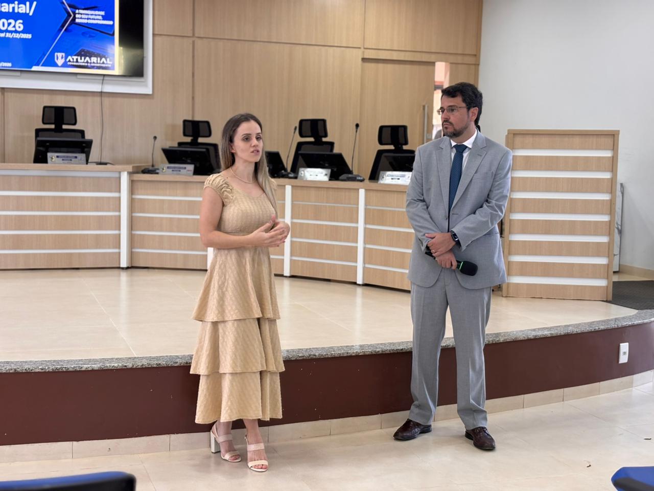 Na manhã desta segunda-feira (23), a prefeitura municipal promoveu a Palestra de Apresentação do Cálculo Atuarial 2026 e da Política de Investimentos 2026 da Previdência Municipal, reunindo autoridades, servidores e beneficiários no auditório do Poder Legislativo.