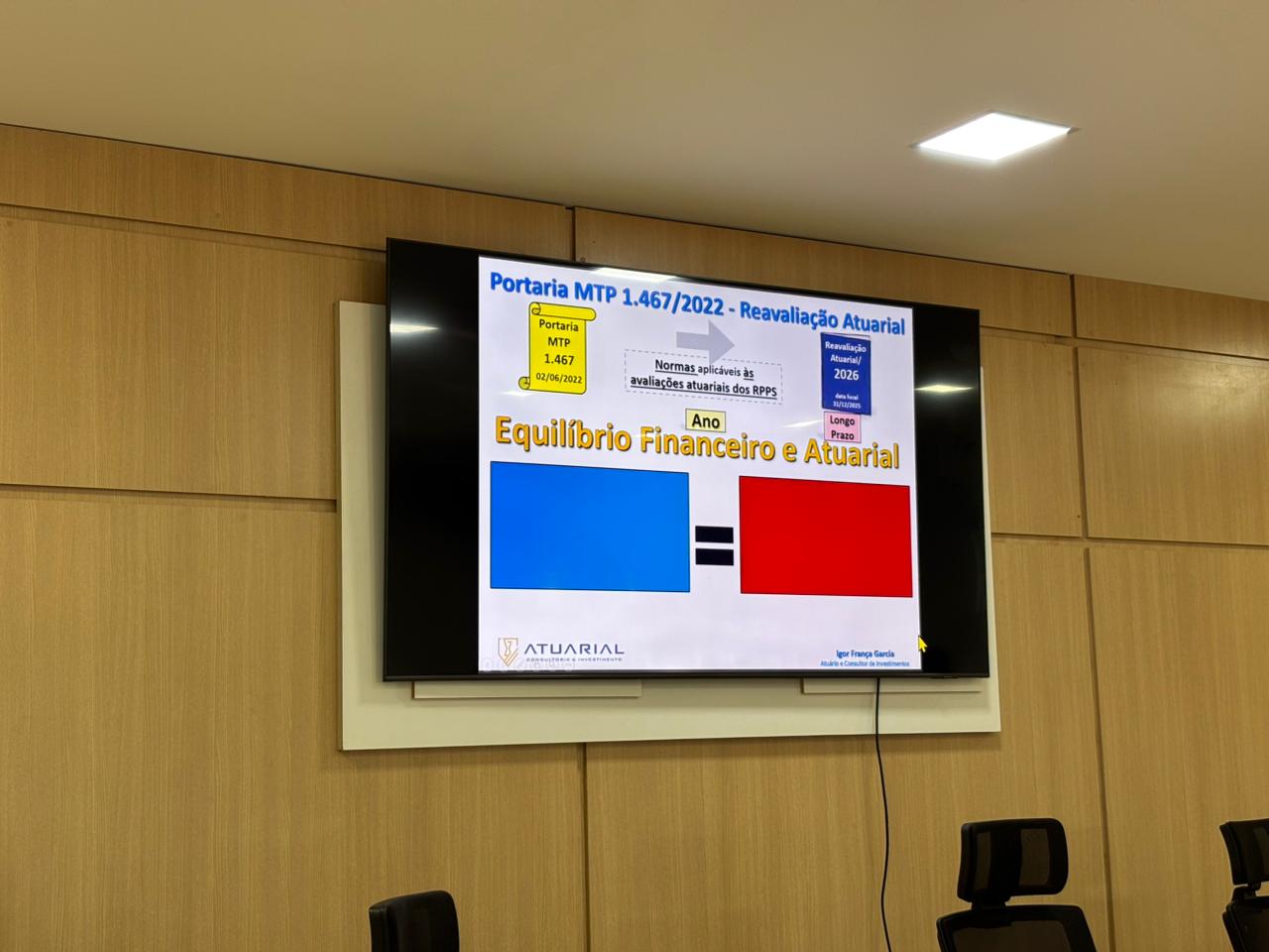 A palestra foi conduzida pelo atuário, Igor França Garcia, que apresentou os dados técnicos, projeções atuariais e as diretrizes de aplicação dos recursos, destacando a importância de uma gestão responsável e alinhada às normas vigentes.
