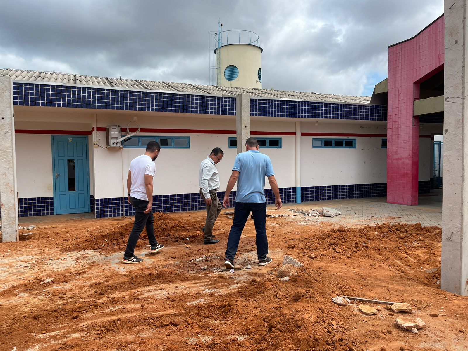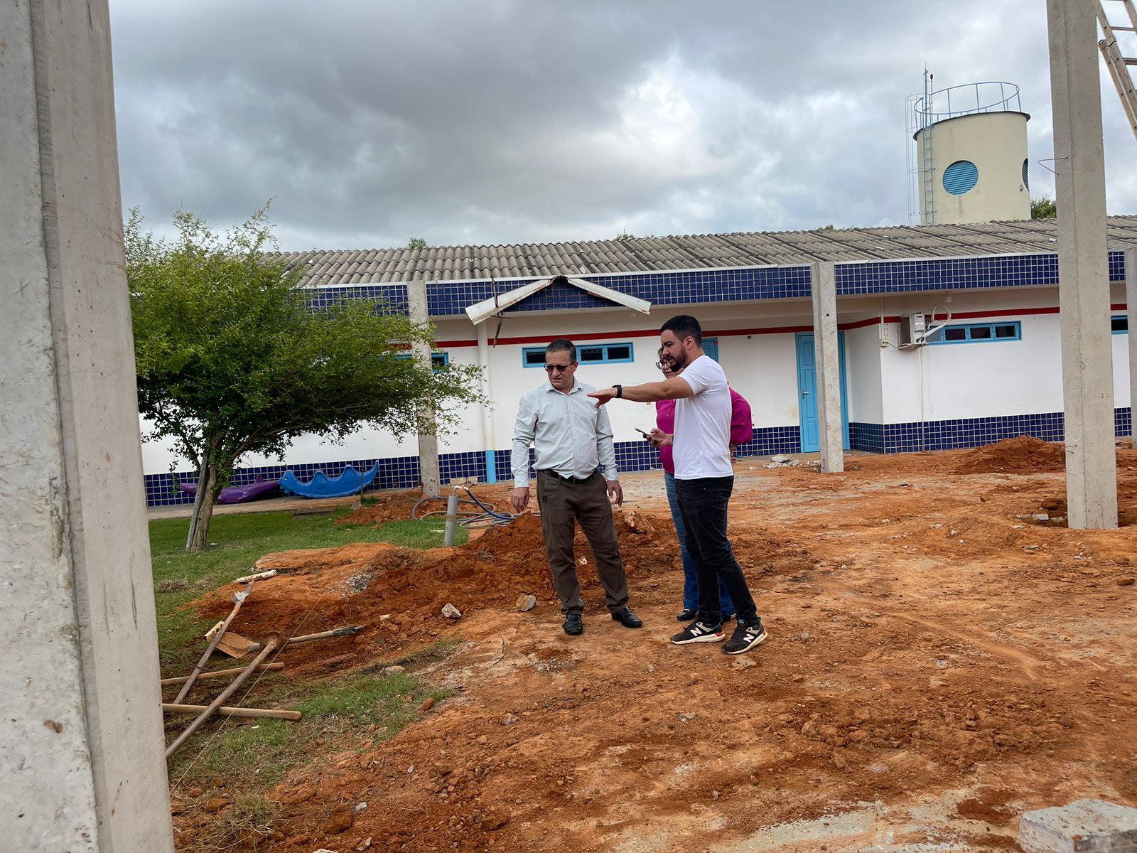 Aproveitando a ocasião, os mesmos estiveram realizando vistorias no local onde será construído o muro que separa o CEMEI da quadra poliesportiva. Ambas as obras são indicações de emendas impositivas do Poder Legislativo, a cobertura do saguão é uma indicação do Vereador Heder Sais Machado e a indicação para a construção do muro veio do Vereador Fábio Cavalcante (Bob).