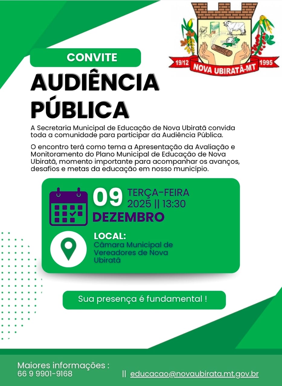 A Secretária Municipal de Educação de Nova Ubiratã convida toda a comunidade para participal da Audiência Pública que terá como tema: Avaliação e Monitoramento do Plano Municipal de Educação de Nova Ubiratã - MT.